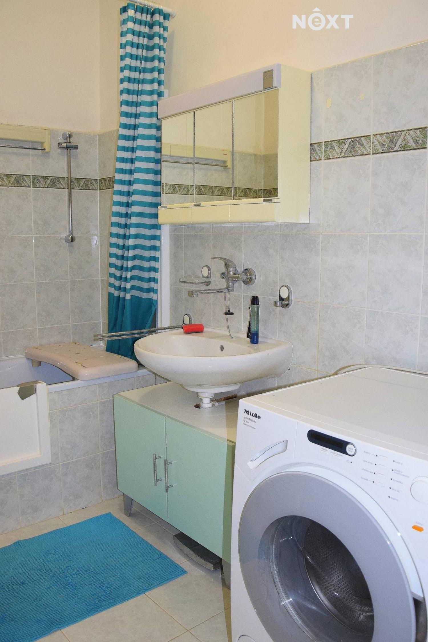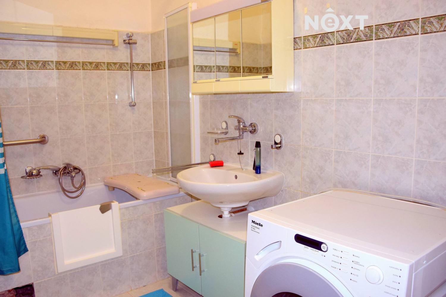 Koupelna je vybavena vanou, zrcadlovou skříňkou a pračkou Miele, toaleta odvětraná oknem je samostatná.