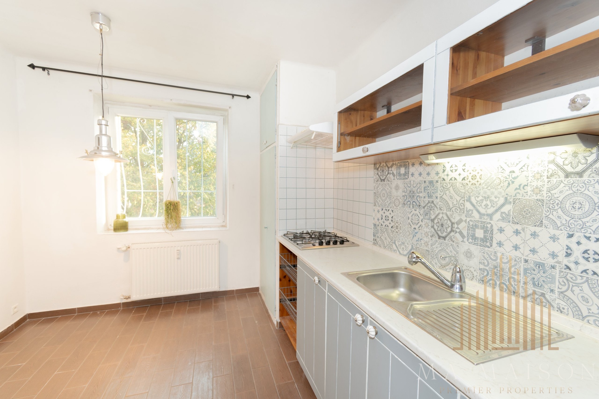 Byt má atypickou dispozici, která nabízí dostatek prostoru a pohodlí. Sestává ze vstupní chodby, samostatné kuchyně s jídelní částí a vybavené kuchyňské linky (sporák, digestoř, trouba, mikrovlnná trouba, pračka), dále z prostorného obývacího pokoje/ložnice, koupelny s vanou a samostatné toalety. K bytu náleží také sklepní kóje. Vytápění je centrální, ohřev vody i vaření plynem.