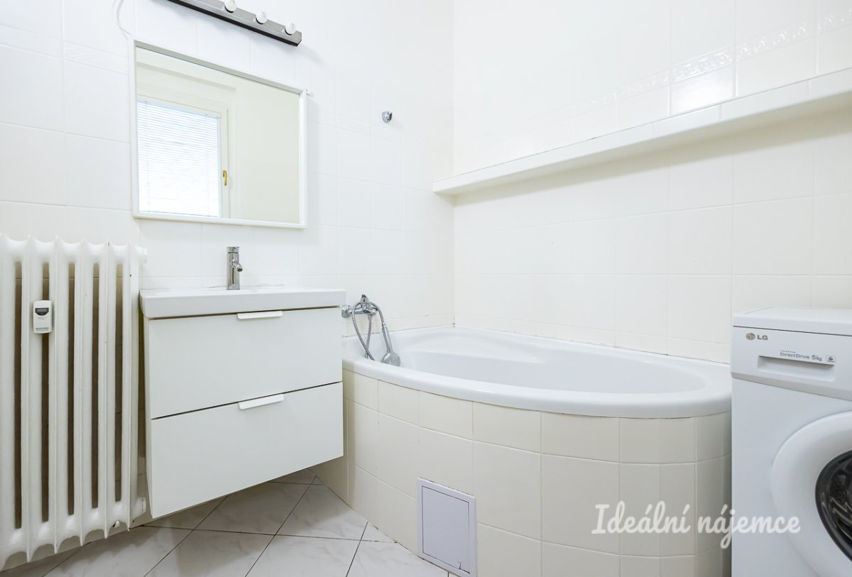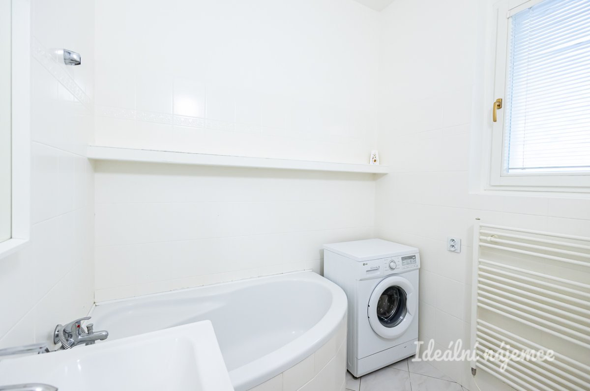 Koupelna je vybavena rohovou vanou, toaletou a umyvadlem, k dispozici je i pračka.