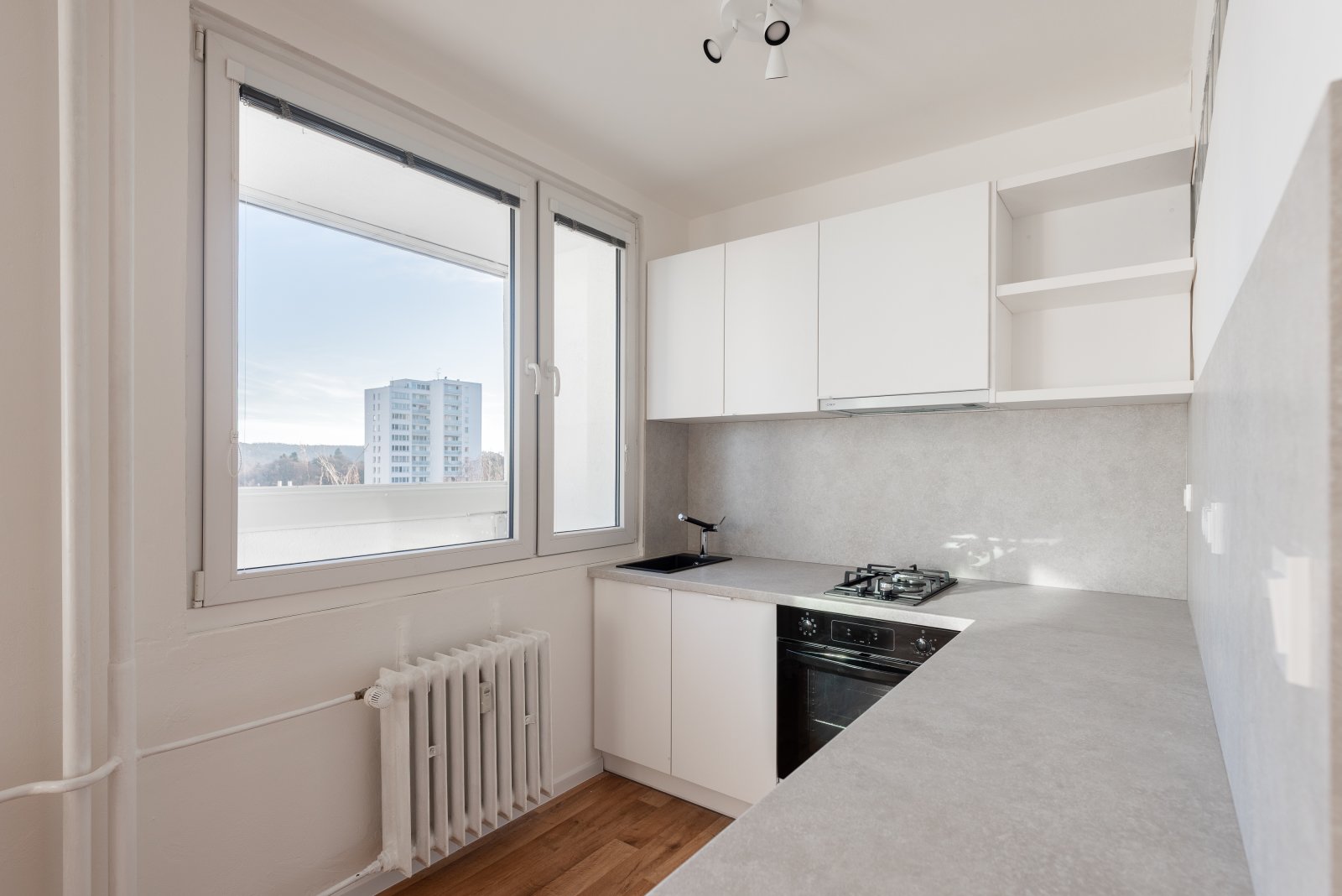 Kuchyňský kout byl osazen zcela novou bílou kuchyňskou linkou, která je nejen elegantní, ale i praktická. Nabízí dostatek pracovní plochy, mnoho úložných prostor a je vybavena velkou troubou, plynovým sporákem s digestoří, myčkou nádobí a lednicí s menším mrazákem. Vaření navíc zpříjemňuje velké okno, díky kterému je kuchyň krásně světlá po celý den.