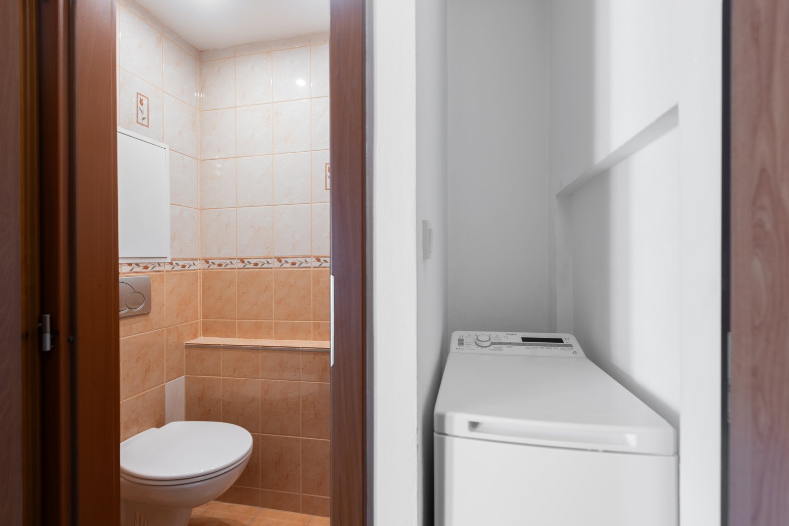 Koupelna je vybavena vanou, přirozeným světlem přes luxfery a celkově příjemnou atmosférou. Toaleta je samostatná. Pračka, která je součástí pronájmu, je chytře umístěna ve výklenku na chodbě. Úložné prostory řeší velké vestavěné skříně. Život vám zpříjemní bezpečnostní dveře Sherlock, optický internet a velká okna se žaluziemi.