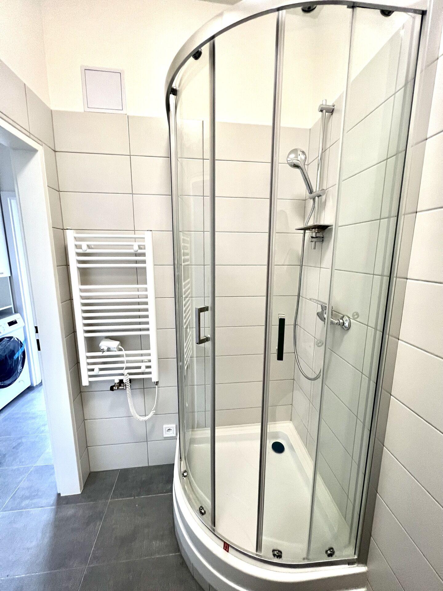 Nabízí prostornou vstupní chodbu, odkud se vchází do obytné místnosti s prostornou šatní skříní, dále se pak vachází do oddělené kuchyně, která je plně vybavená (myčka, lednice, sklokeramická varná deska,...) a koupelny se sprchovým koutem, topným žebříkem a pračkou. K bytu náleží sklepní kóje.