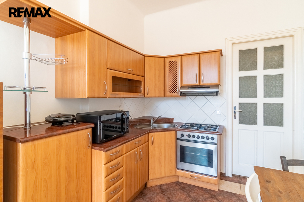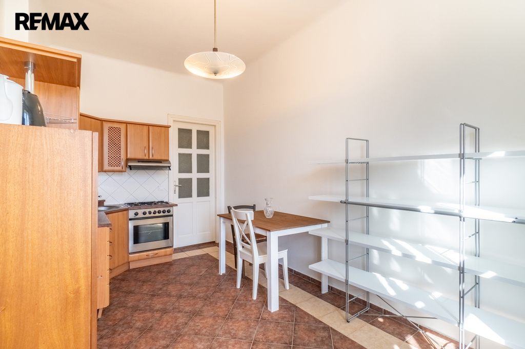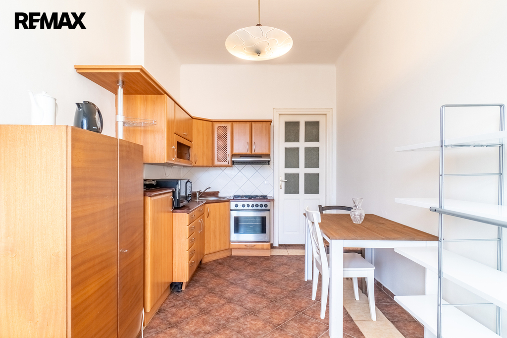 Samostatná kuchyň je vybavena jídelním stolem se dvěma židlemi, kuchyňskou linkou s mikrovlnnou troubou, toustovačem, varnou konvicí a dostatkem úložných skříněk. Sporák je plynový. Okna z kuchyně směřují do klidného vnitrobloku, což zaručuje příjemné a nerušené prostředí.