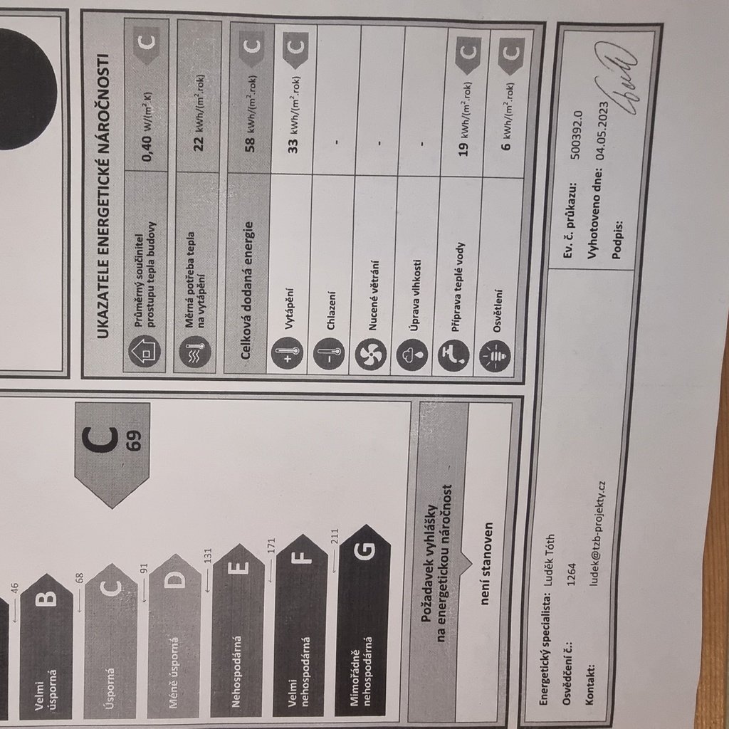 - Ukazatel energetické náročnosti budovy: 69 kWh/m²