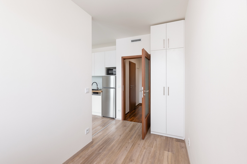 V bytě je již instalována nová vestavěná skříň, přičemž v chodbě zůstává dostatek místa pro umístění další šatní skříně.