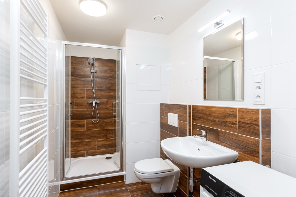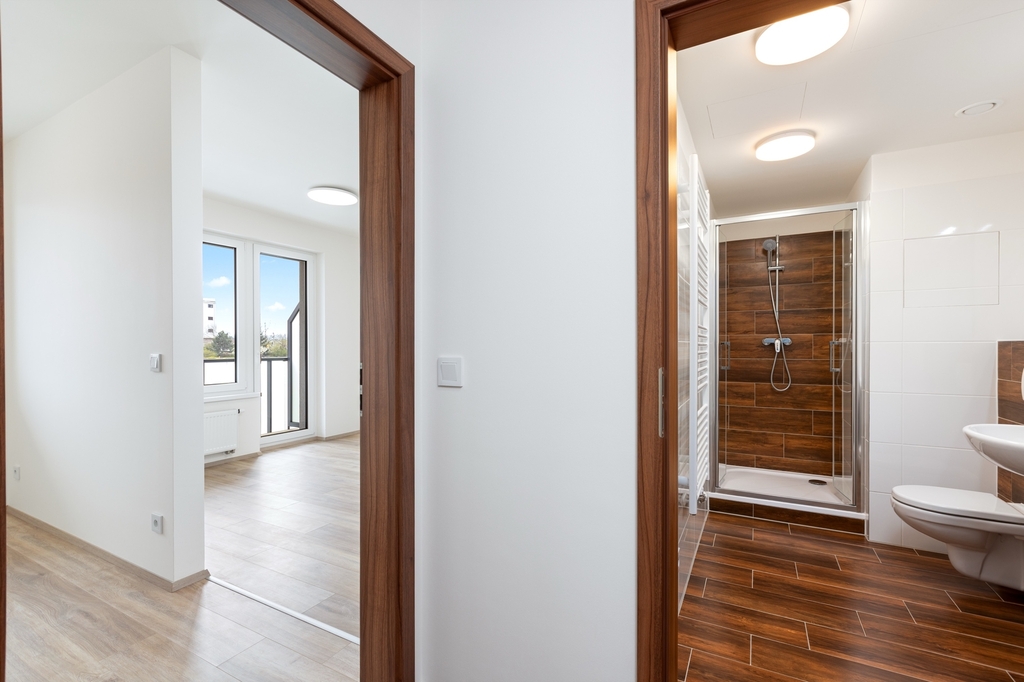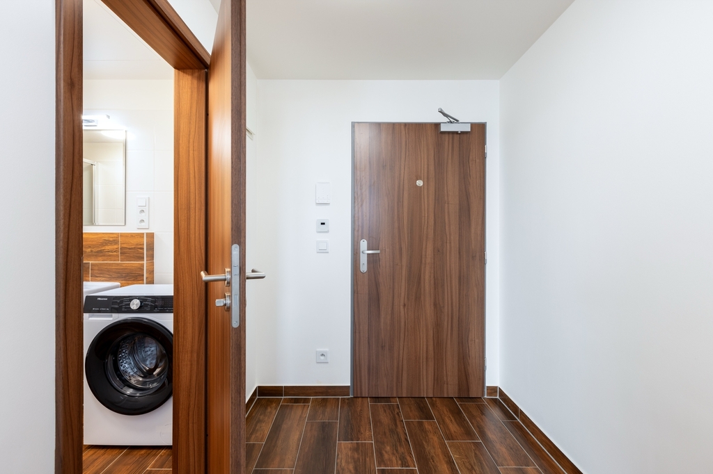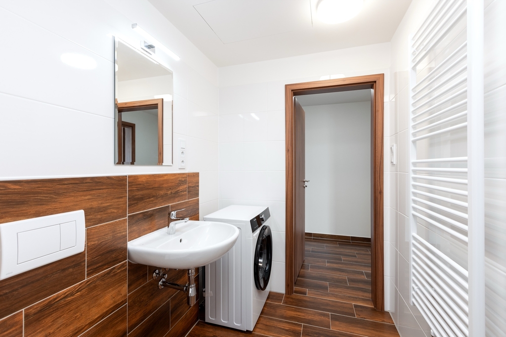 V koupelně najdete sprchový kout, toaletu a novou pračku, která je již součástí vybavení. Zůstává zde i prostor pro případné umístění sušičky.