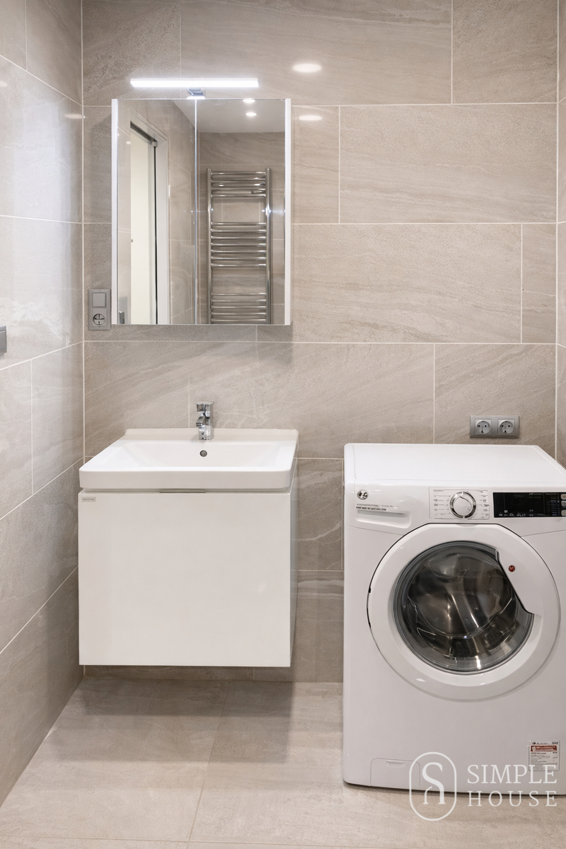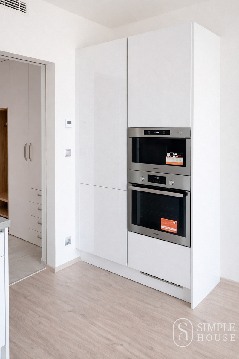 Byt nabízí kvalitní a nadstandardní provedení. Dispozice zahrnuje vstupní chodbu s prostornou vestavěnou skříní, moderní koupelnu se sprchovým koutem, sanitou, koupelnovou skříňkou s LED osvětlením a pračkou s integrovanou sušičkou. Hlavní obytná místnost je vybavena kuchyňskou linkou na míru s vestavěnými spotřebiči – indukční varnou deskou, elektrickou troubou, mikrovlnnou troubou, myčkou nádobí, kombinovanou lednicí s mrazákem a digestoří. V místnosti je vinylová podlaha a vstup na lodžii přes velkoformátová posuvná okna s trojskly.