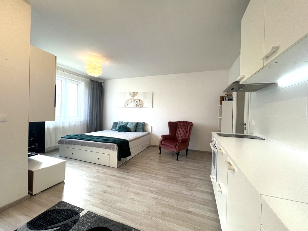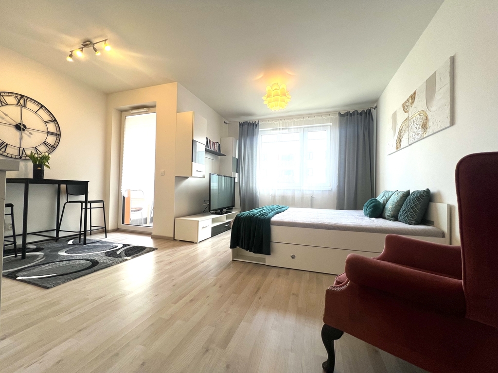 Nabízíme k pronájmu krásný byt 1+kk s balkonem umístěný ve 4. nadzemním podlaží novostavby bytového domu v ulici Strnadových, Praha 9 - Vysočany. Vybavení bytu: kuchyňská linka, lednice, indukční varná deska, manželská postel s úložným prostorem, obývací stěna, pračka, velká vestavěná skříň v předsíni. Celý interiér je laděn do světlých barev, byt tak působí čistým a vzdušným dojmem. Z obývacího prostoru je přímý vstup na balkon orientovaný na východ. Základní nájemné je 18 500,- Kč plus 4 500,- Kč poplatky za elektřinu, topení, vodu, úklid, odpad, apod. Vratná kauce je ve výši dvou plných měsíčních nájmů. Při podpisu nájemní smlouvy se skládá 23 000,- Kč jako provize RK. Dům se nachází v klidné lokalitě novostaveb, zastávka tramvaje a stanice metra je 3 min od domu. V těsné blízkosti je plná občanská vybavenost, obchodní centrum Fénix, zdravotnická zařízení, restaurace apod. Byt je k dispozici od 20.2.2026.