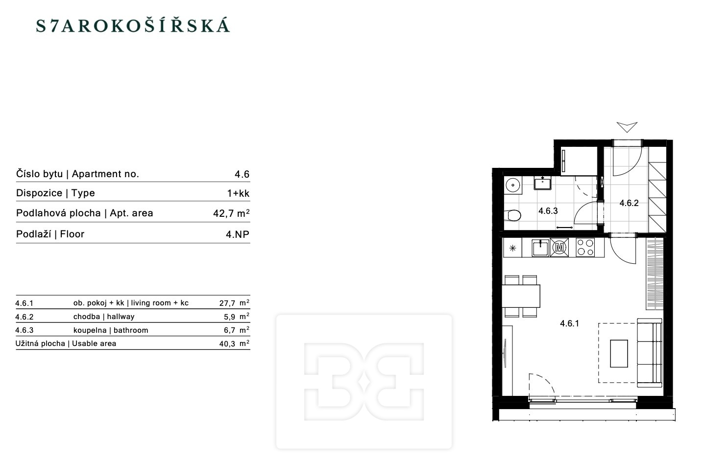 | Dispozice/podlahová plocha: | 1+kk/43 m² |