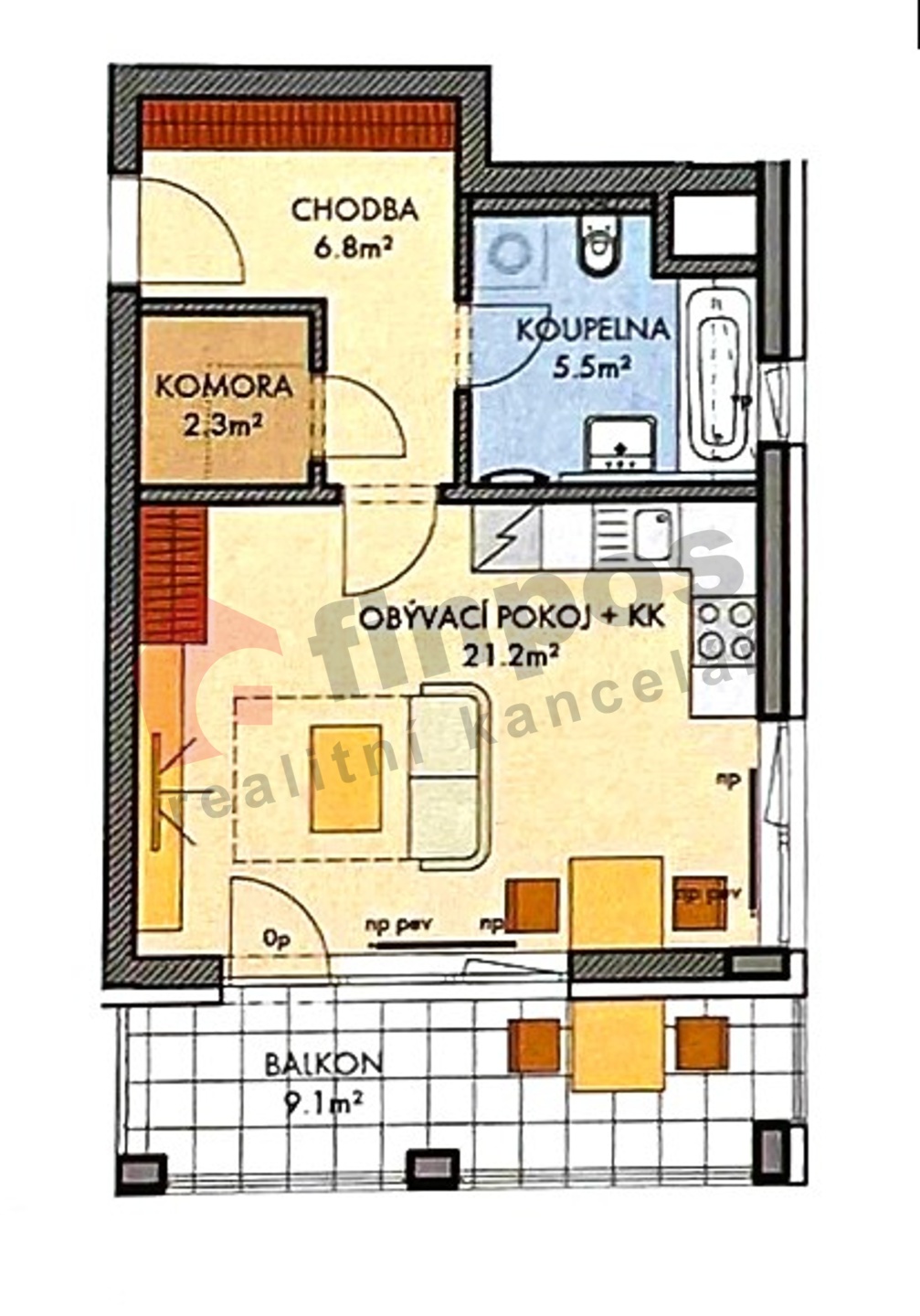 - Dispozice bytu: 1+kk