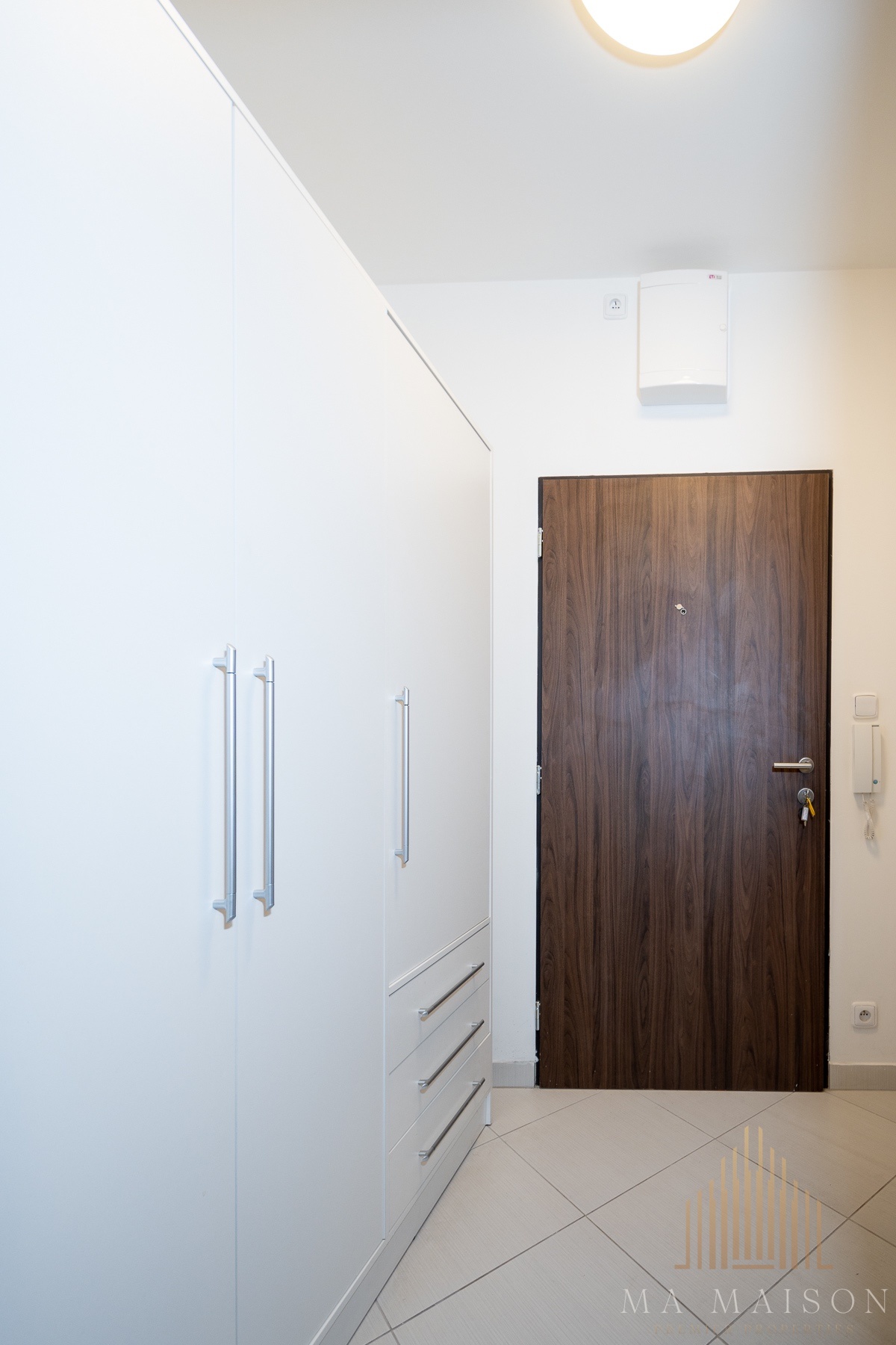 Byt se nachází v 1. patře novostavby s výtahem a sestává ze vstupní předsíně se šatní skříní, koupelny s vanou, toaletou a místem na pračku, obývacího pokoje s kuchyňským koutem. Součástí vybavení kuchyně je k dispozici trouba s elektrickou varnou deskou a lednice.