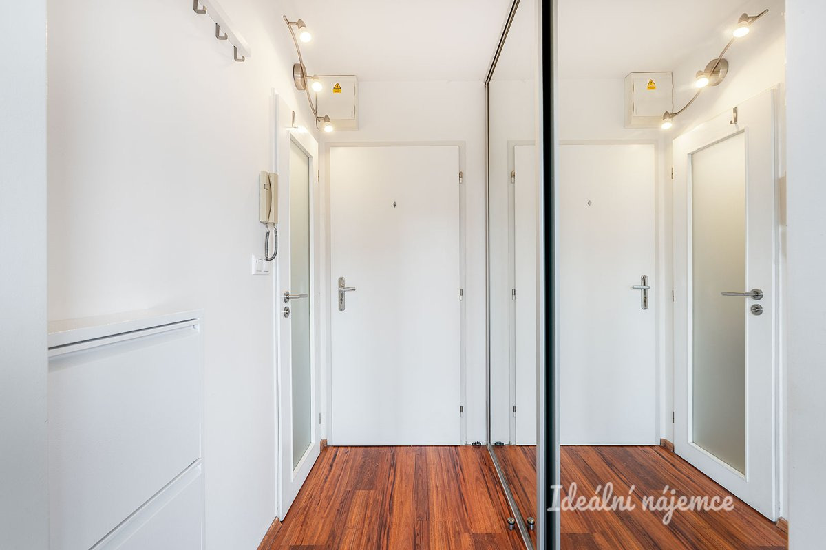 Byt se nabízí plně vybavený. Kuchyňský kout je osazen všemi potřebnými spotřebiči – lednicí s mrazákem, myčkou, varnou deskou, digestoří, elektrickou troubou i pračkou. Obytná část je zařízena jídelním stolem se židlemi, komodou, knihovnou a postelí s matrací, takže nabízí příjemné zázemí pro každodenní bydlení. Koupelna je vybavena sprchovým koutem, umyvadlem, zrcadlem, koupelnovou skříňkou a toaletou. V předsíni oceníte vestavěnou skříň, věšák i botník.