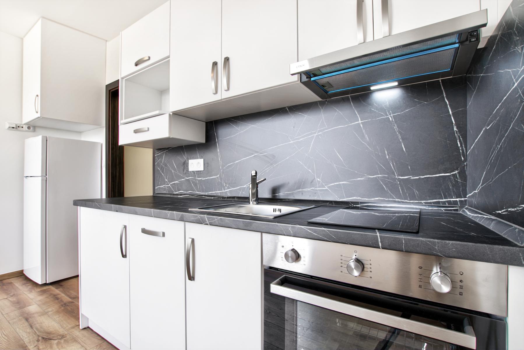 Byt tvoří obytný prostor s plně vybavenou kuchyňskou linkou - elektrická trouba, sklokeramická varná dvou plotýnka, digestoř, integrovaná myčka nádobí, pračka se sušičkou, mikrovlnná trouba a samostatně stojící lednička s mrazákem.