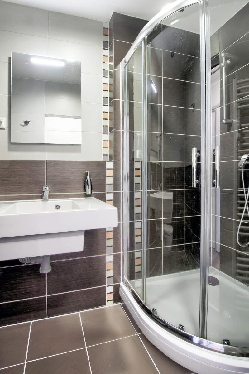 Praktická předsíň je vybavená velkou skříní. Koupelna se sprchovým koutem, keramické umyvadlo, toaleta a fén.