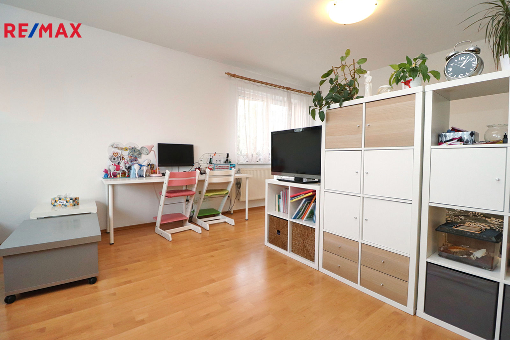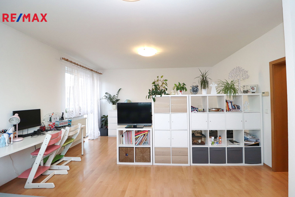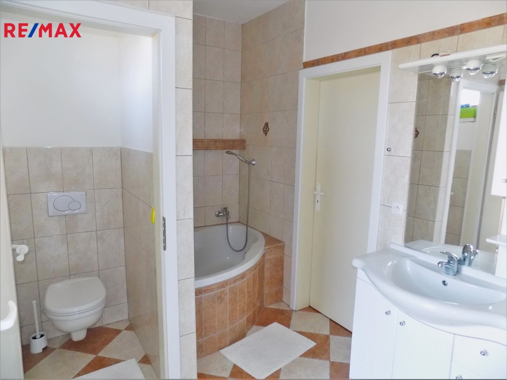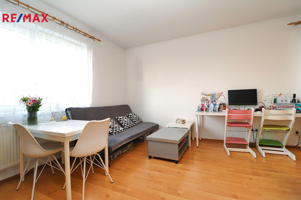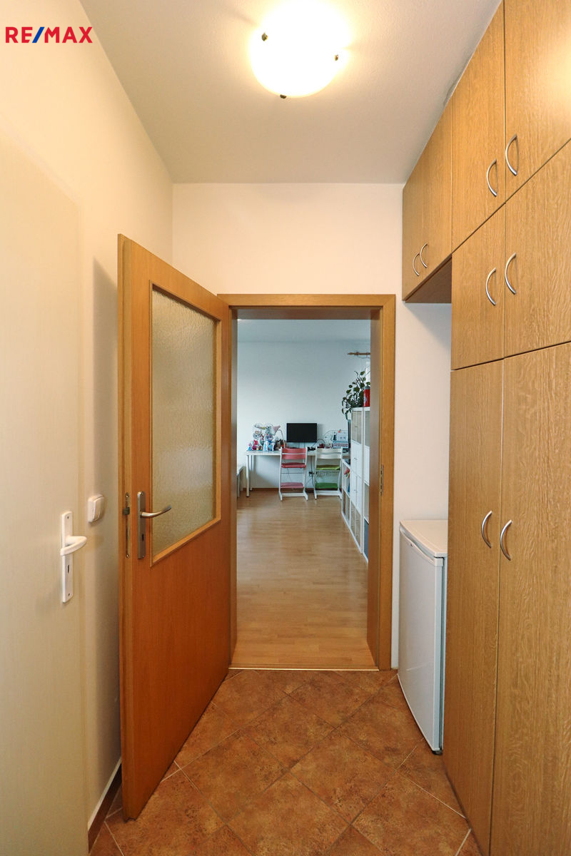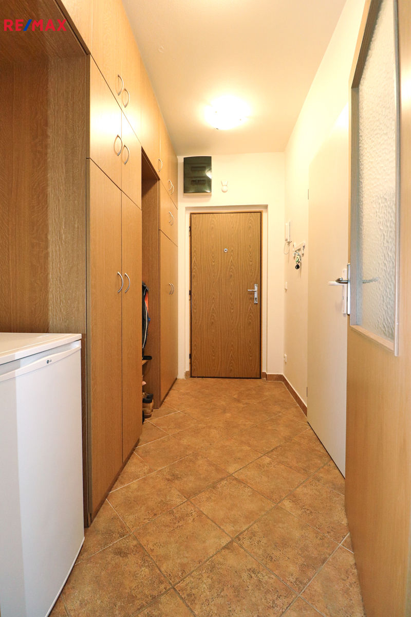 Byt umístěný v 1. patře je tvořen předsíní s vestavěnými skříněmi, které zajišťují dostatek úložného prostoru a lednicí. Obytná místnost spojená kuchyňským koutem je vybavená sklokeramickou varnou deskou, digestoří, dřezem, jídelním stolem a židlemi. Ostatní vybavení, které je na fotkách bude odvezené. Z obývací části se dostaneme na první balkon. Koupelna disponuje rohovou vanou, umyvadlem, připojením na pračku a odděleným WC. Na koupelnu navazuje druhý balkon. V obývací části je položena plovoucí podlaha, v chodbě a koupelně je dlažba.