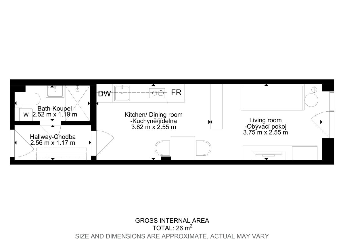 | Dispozice/podlahová plocha: | 1+kk/25 m² |