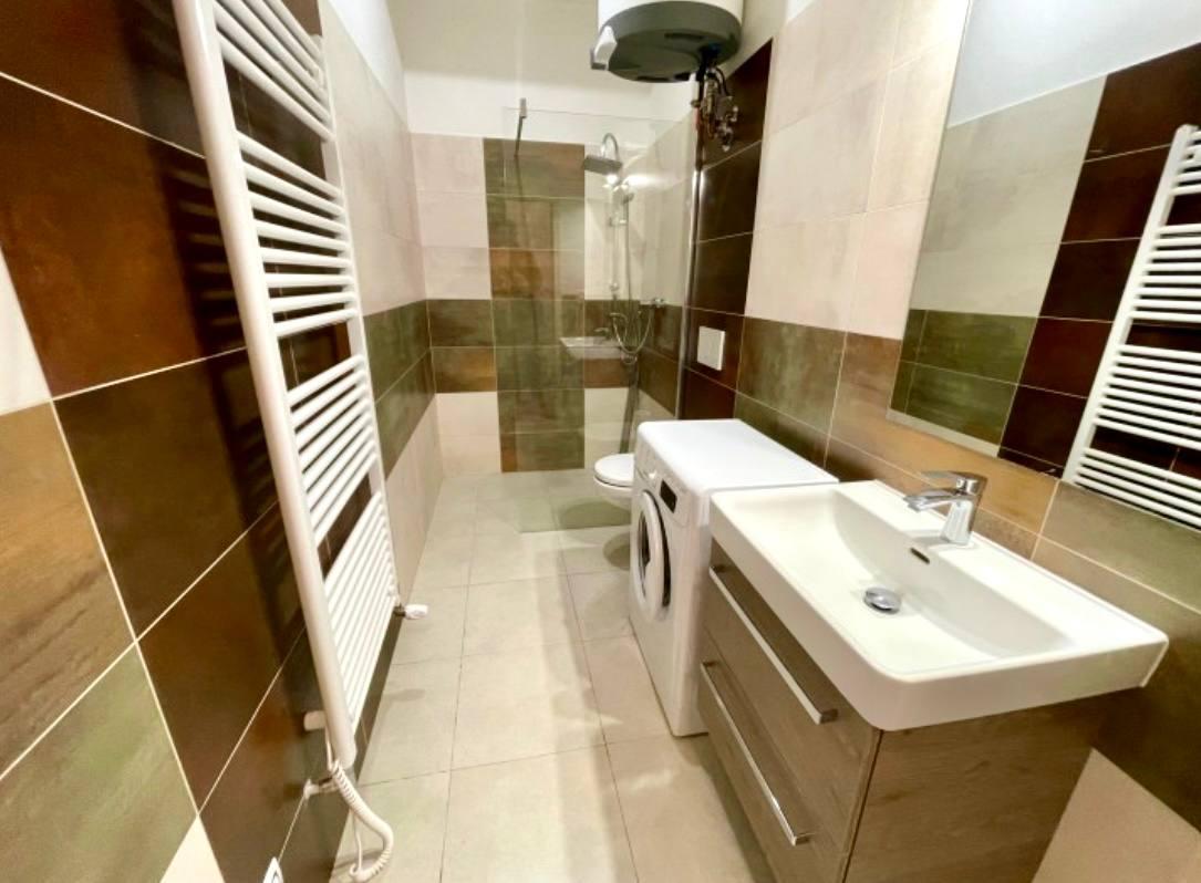 Velkou výhodou je možnost využívání společného bazénu a zelené střešní terasy, které jsou k dispozici obyvatelům domu během teplých měsíců.