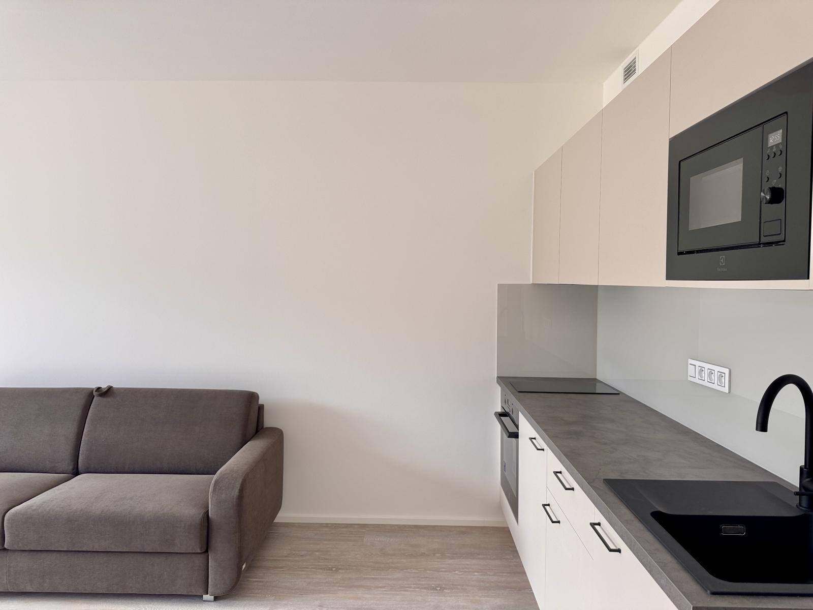 Nabízíme k pronájmu zcela nový byt 1kk (cca 40 m) s balkónem ve 1. NP moderní rezidence z roku 2025. Byt je dosud neobývaný, vybavení je nové kuchyň, sprcha, právě se instaluje skříň a bude dodána pračka. K bytu náleží sklep a k dispozici je i kočárkárna. Výhled do vnitrobloku, klimatizace.