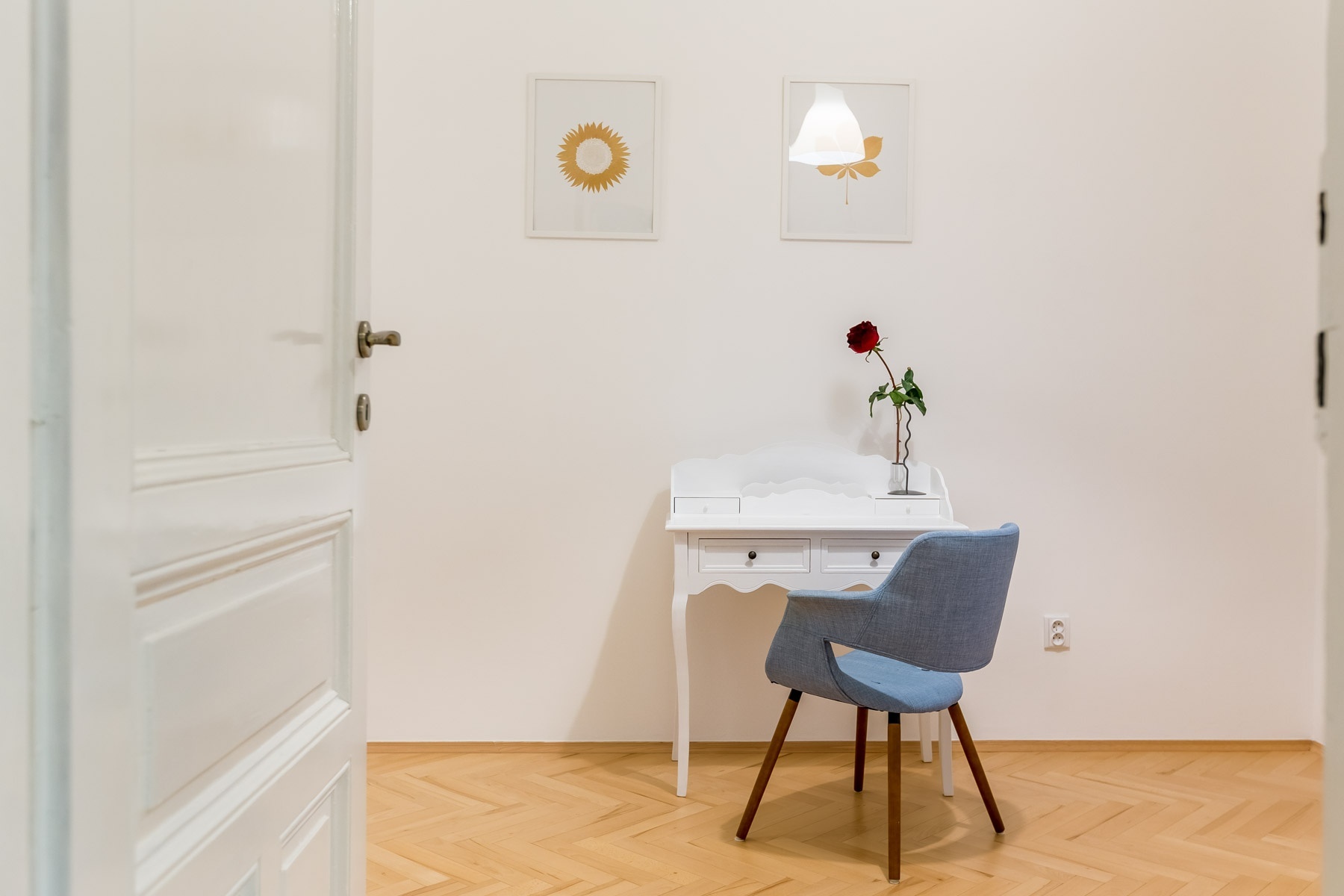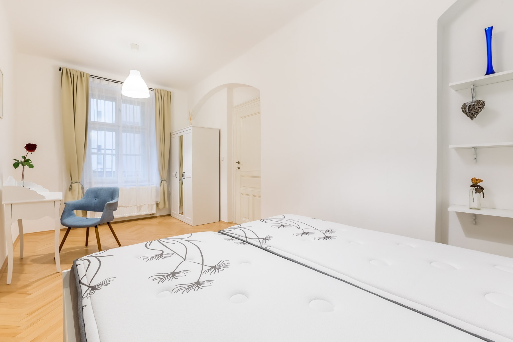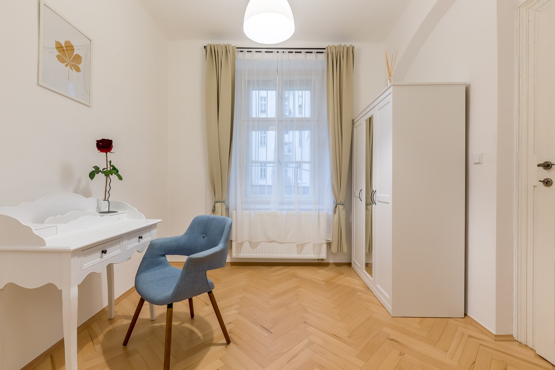 Byt se sestává z obývacího pokoje s okny do klidné ulice Na Smetánce. Nová kuchyň, která se nachází na prostorné chodbě a ložnice jsou orientovány do vnitrobloku.