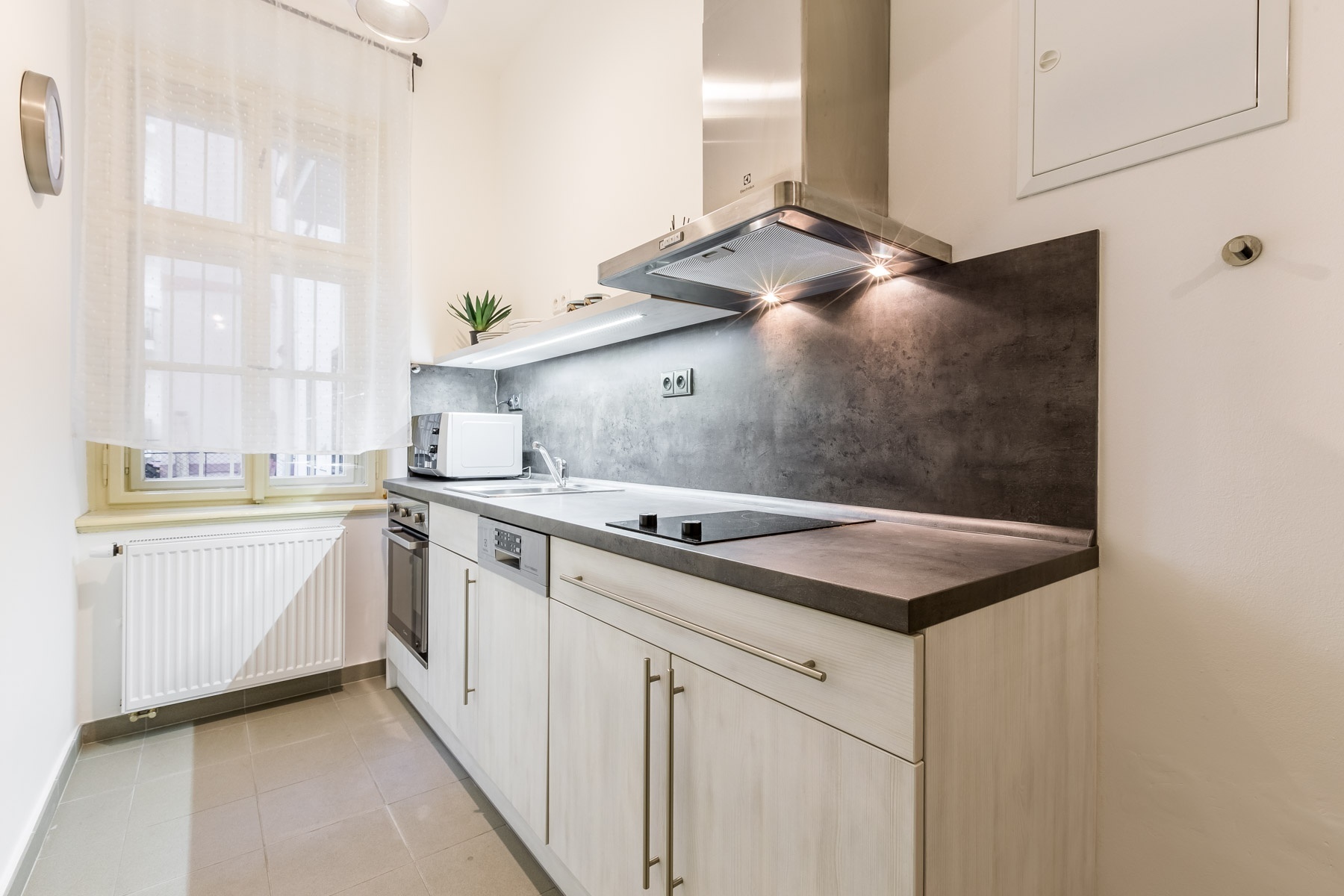 Kompletní vybavení zahrnuje zcela novou vybavenou kuchyňskou linku se spotřebiči, indukční varnou desku, myčku, pračku, lednici s mrazákem, dřevěné parkety, dostatek úložných prostor v každém pokoji.