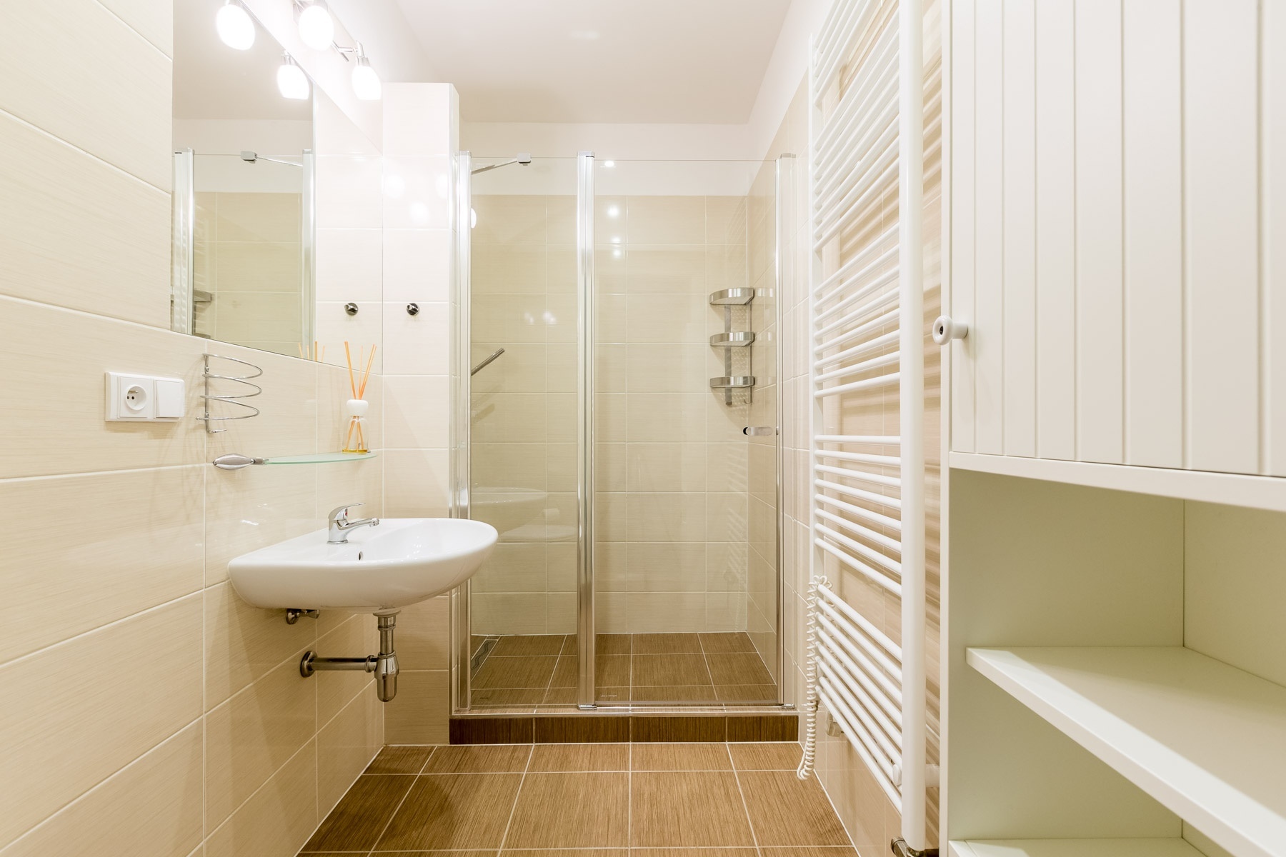 Koupelna je osazená prostorným sprchovým koutem, keramickým umyvadlem a toaletou