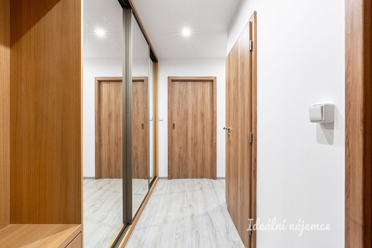 Tento byt je definicí světlosti a efektivního využití prostoru. Vestavěná skříň a úložná řešení po celém bytu jsou navržena tak, aby pojala vše potřebné, aniž by byt působil přeplněně. Srdcem bytu je obývací pokoj s pohodlnou pohovkou, pracovním stolem a přípravou pro závěsnou TV. Kuchyňský kout je oddělená a maximálně funkční. Vše máte doslova na dosah ruky – včetně moderních spotřebičů a myčky, která vám ušetří čas. Moderní koupelna disponuje sprchovým koutem a je plně vybavena pračkou i sušičkou. Velkým benefitem je samostatná toaleta, což u této dispozice nebývá vždy pravidlem.