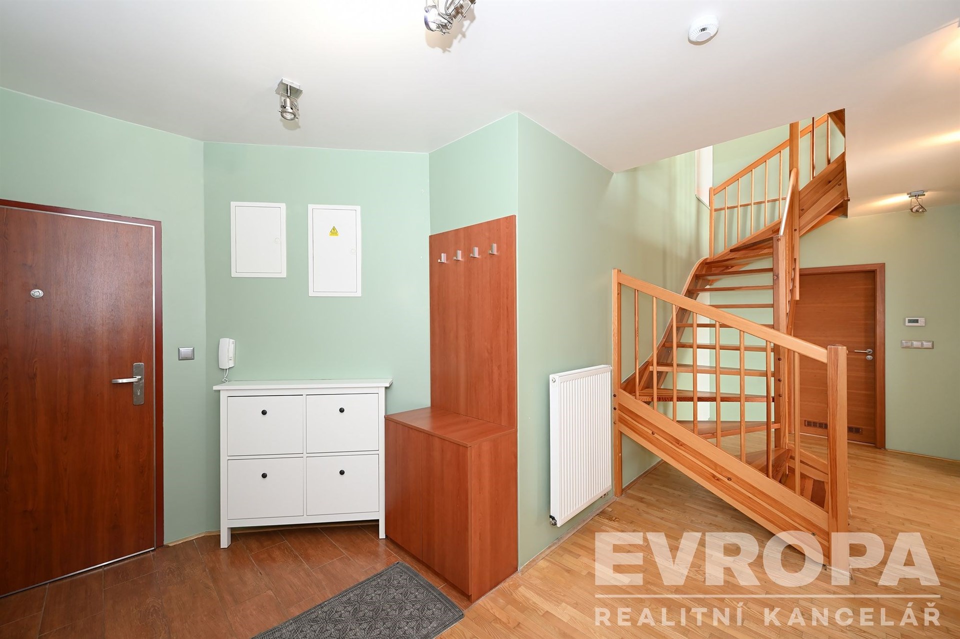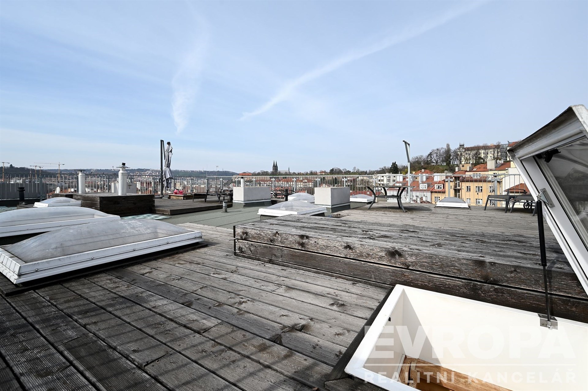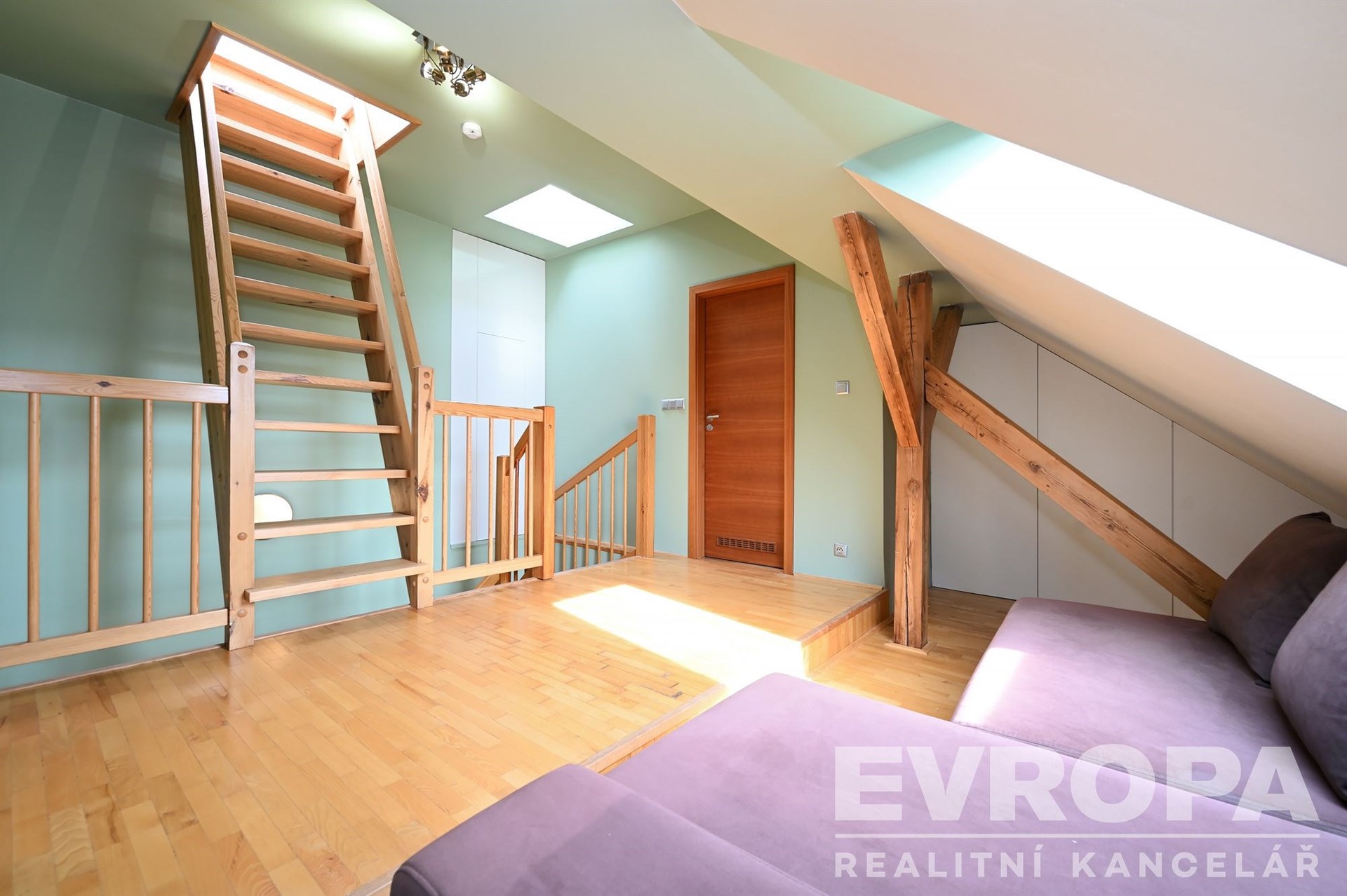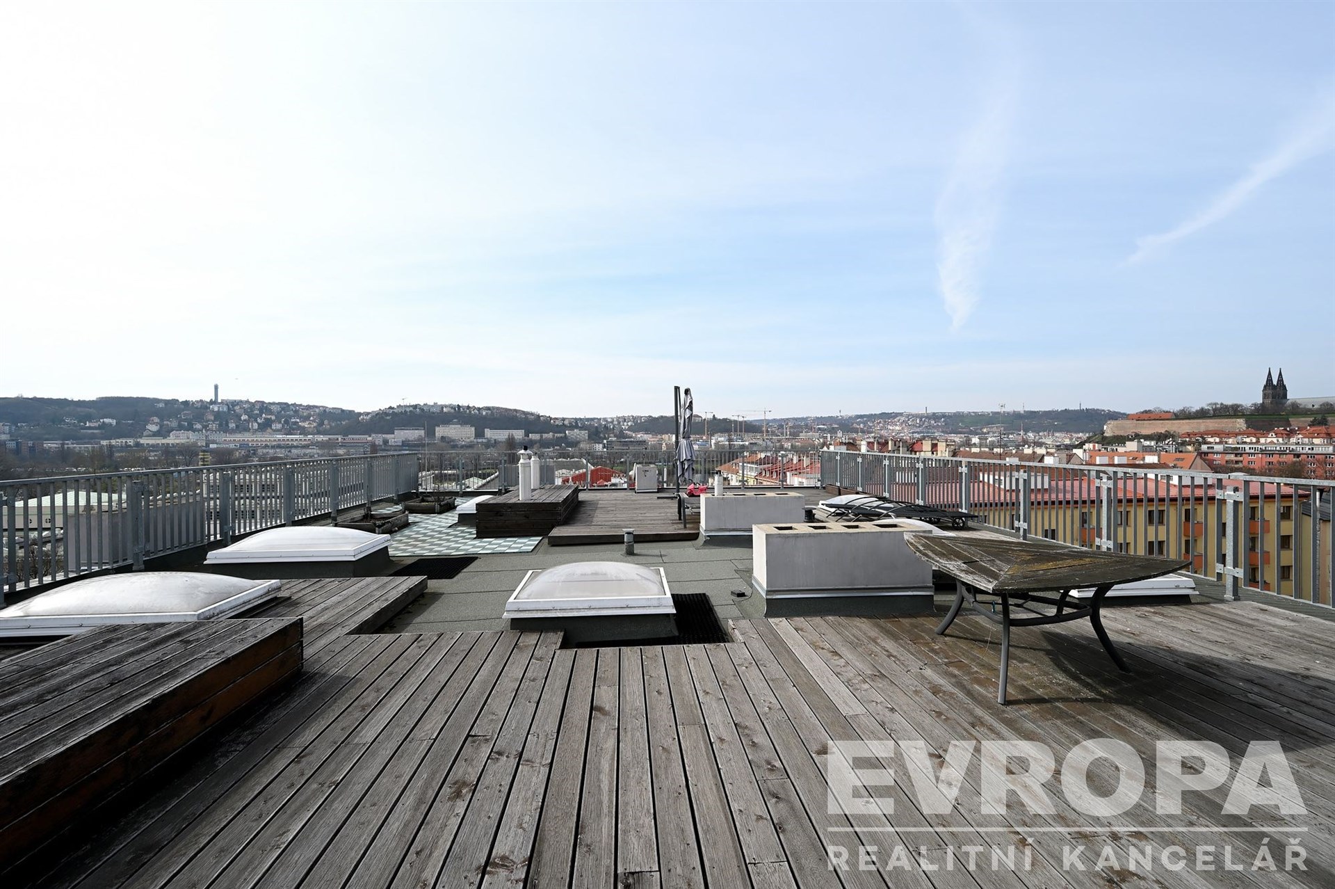Nabízíme k pronájmu kompletně zařízený podkrovní mezonetový byt 2+kk o rozloze 105 m 2, situovaného v 56 N.P. v činžovním domě s výtahem v klidné ulici v Podolí se střešní terasou s výhledem na Prahu. Byt je prostorný, světlý, orientovaný na jižní stranu. Výhodná lokalita s plnou občanskou vybaveností v blízkém okolí, v pěším dosahu MHD s dobrou dostupností na stanice metra a nábřeží Vltavy. V těsné blízkosti bytu je památka Vyšehrad s parkem. Nedaleko je bazén a koupaliště Podolí a Žluté lázně. Podél Vltavy vede oblíbená cyklostezka. Byt má ve spodní úrovni halu, obývací pokoj se vstupem na terasu, plně vybavenou kuchyňskou linku, koupelnu s vanou a toaletou. V patře je hala s výstupem na střešní terasu s nádherným výhledem na Vyšehrad, ložnice, a plně vybavená koupelna se sprchovým koutem a toaletou. Byt se pronajímá kompletně zařízený, včetně nábytku a všech spotřebičů. Ve vnitrobloku domu je možnost parkování, které je v ceně nájmu. Měsíční částka pro platbu nájmu je 37.000,Kč a 7.000,Kč poplatky. K dispozici ihned. Kauce jeden měsíční nájem 37.000,Kč. Pro více informací kontaktujte realitního makléře. Neplatíte provizi RK.