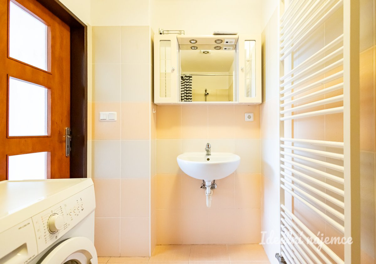 V koupelně je vana, umyvadlo, pračka. Toaleta je umístěna samostatně.