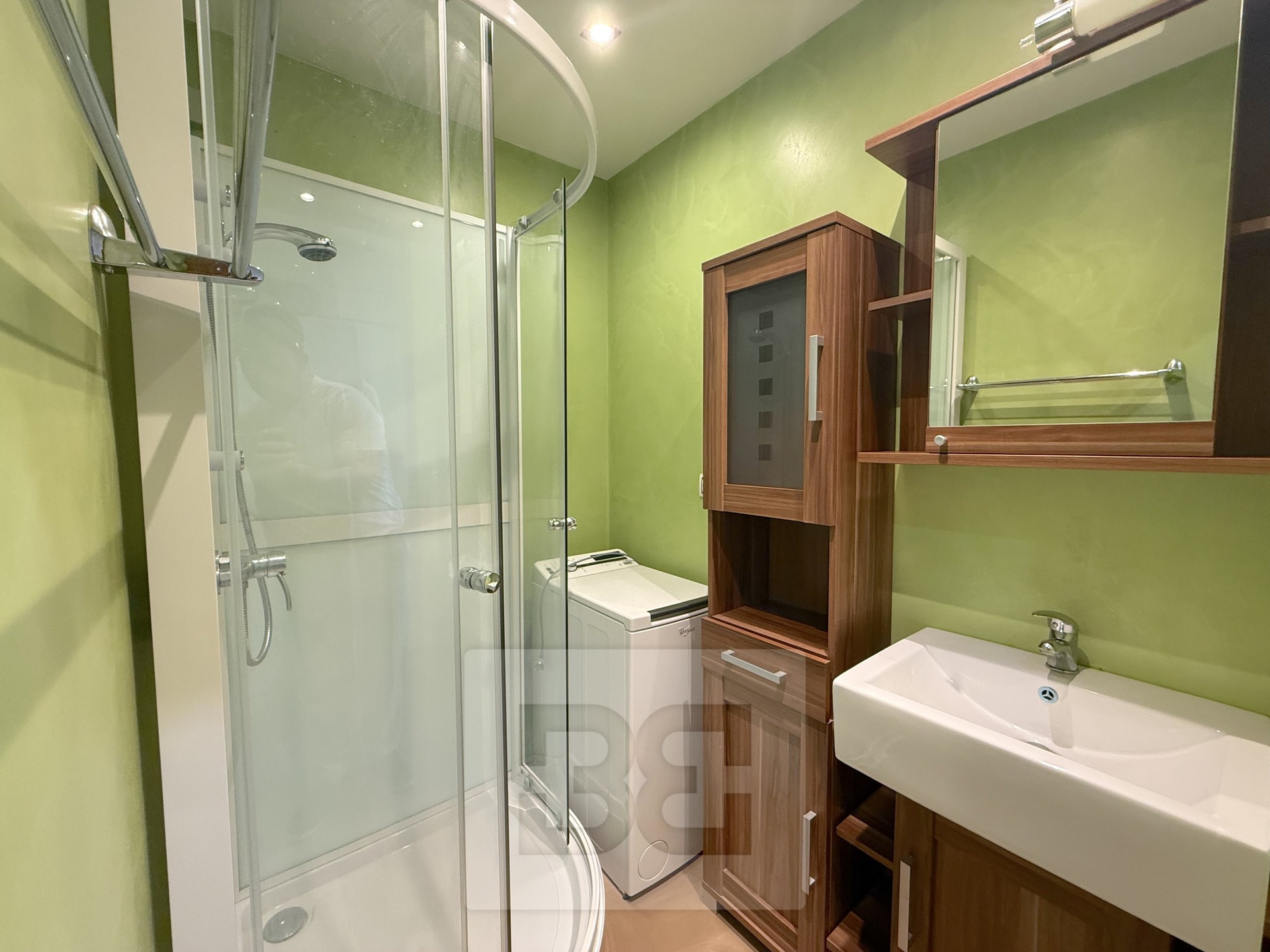 • Koupelna se sprchovým koutem, umyvadlem, pračkou a zrcadlovou skříňkou