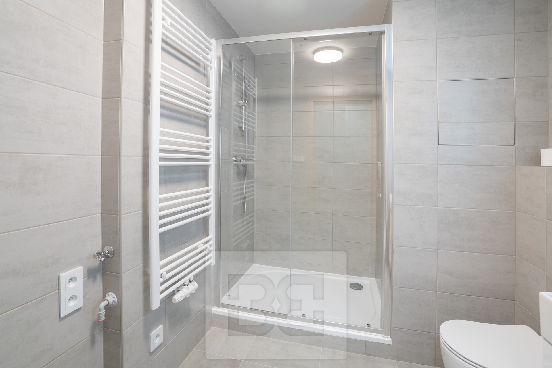 Koupelna je vybavena sprchovým koutem a toaletou, najdeme zde i přípojku na pračku. V předsíni je k dispozici šatní skříň.