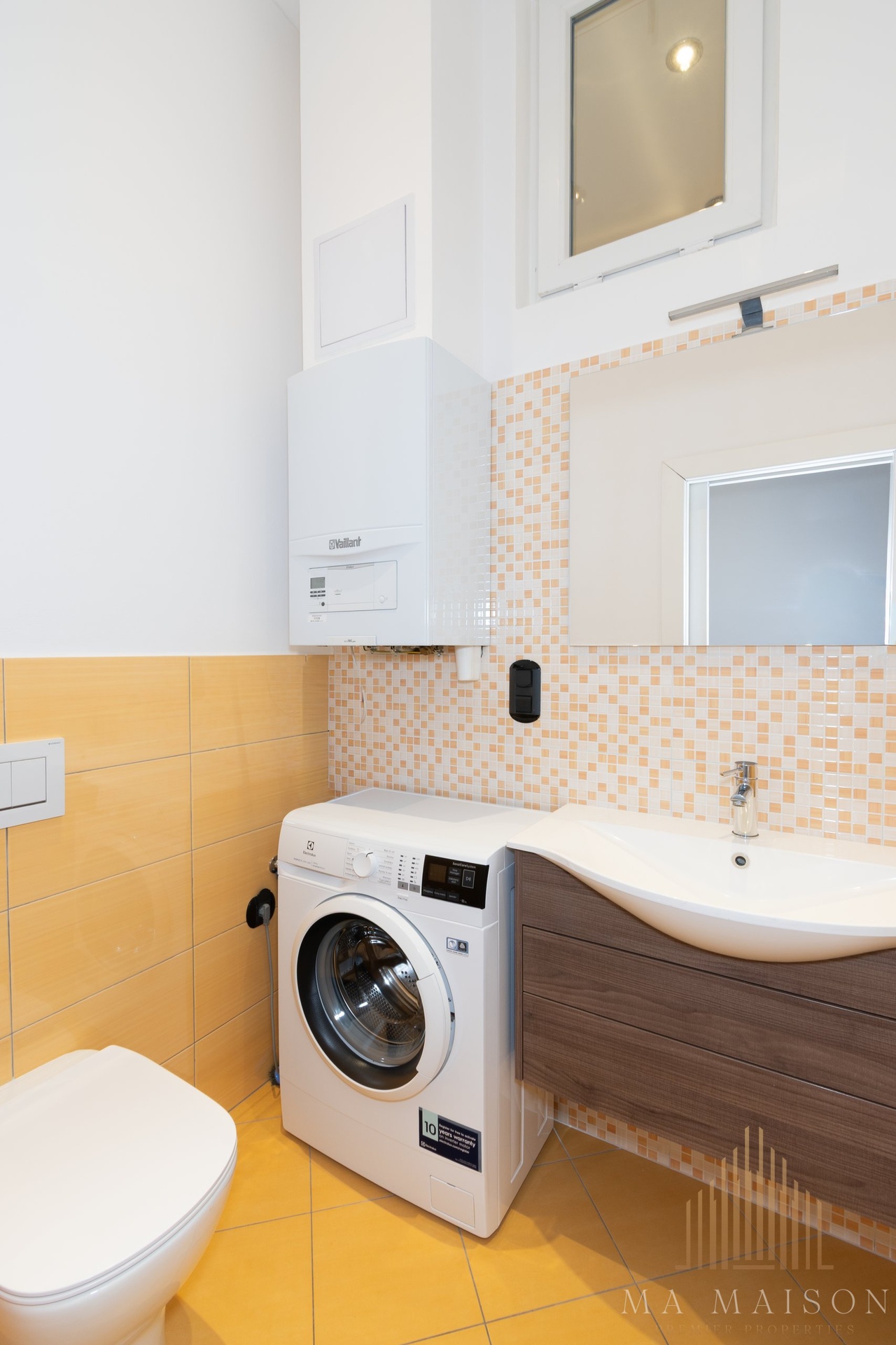 Byt má praktické a promyšlené dispoziční řešení. Vstupní chodba nabízí dostatek úložných prostor. Samostatné WC je vybaveno umyvadlem, pračkou a plynovým kotlem. Ložnice má vlastní koupelnu se sprchovým koutem, WC a umyvadlem. Obývací část je propojena s kuchyní, která je plně vybavena spotřebiči (myčka, lednice, trouba, sporák, sušička, varná konvice, topinkovač) a základním nádobím. Z obývacího pokoje je vstup na balkon.