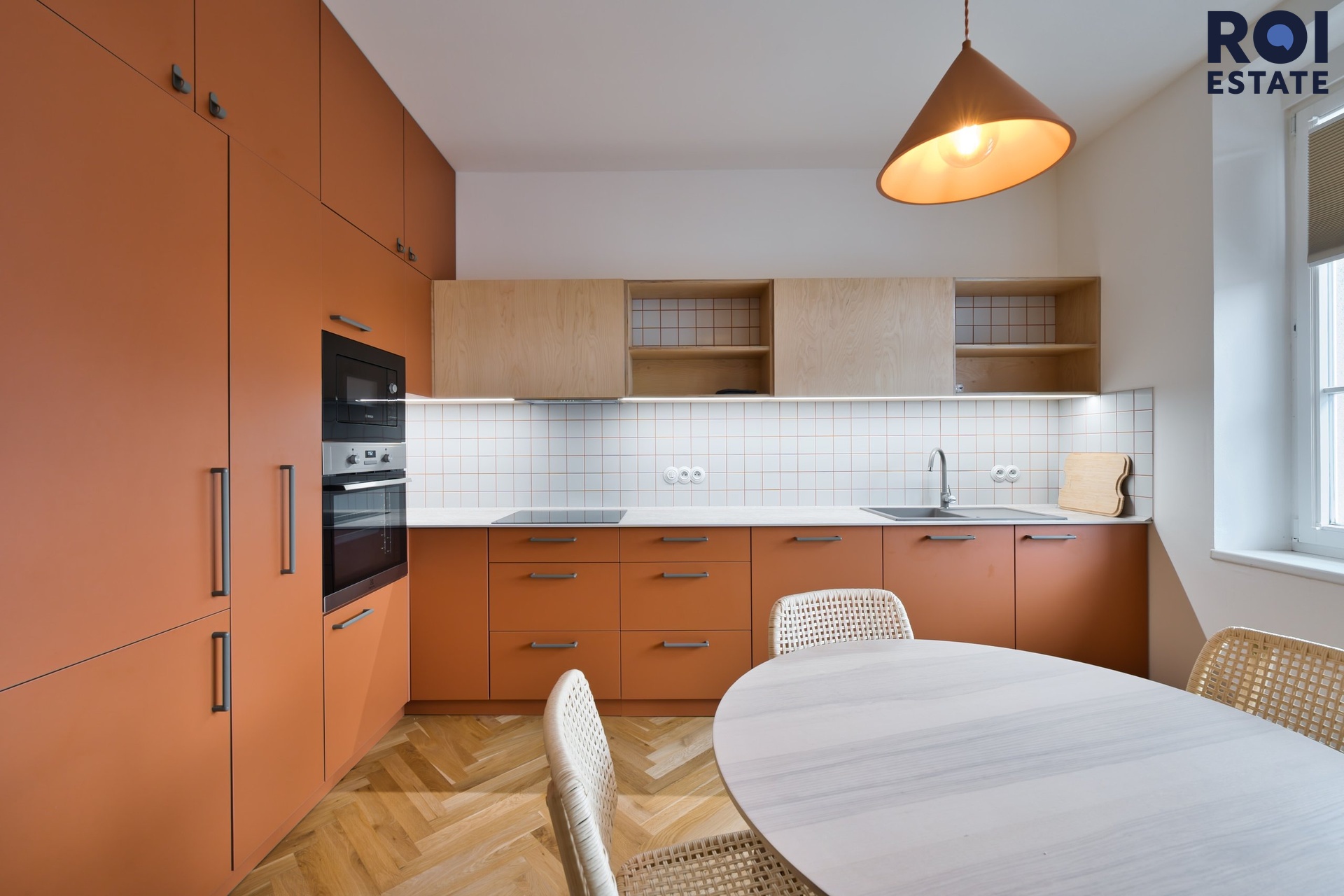 • moderní kuchyňská linka na míru, plně vybavená (vestavná trouba, mikrovlnná trouba, varná deska, lednice, myčka, úložné prostory)