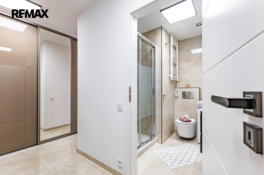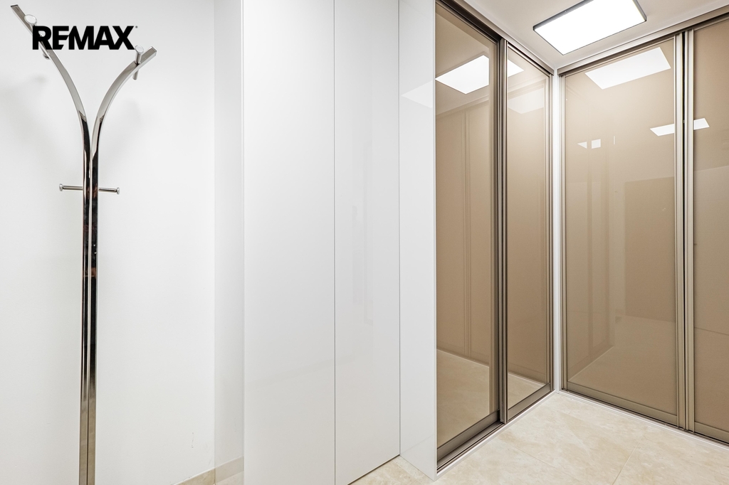 - moderní interiér s mramorovými podlahami a vestavěnými skříněmi