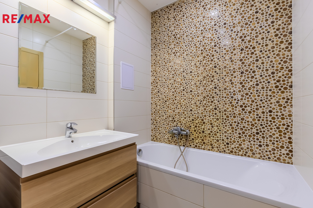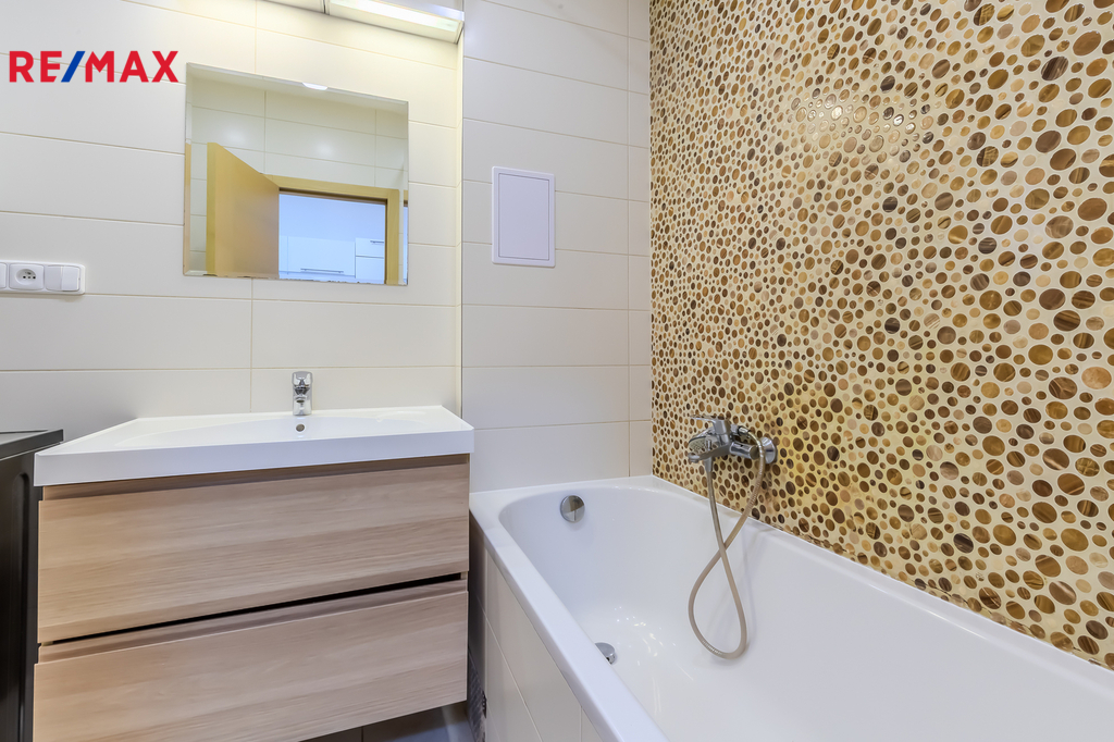 Kuchyň je vybavena lednicí, mrazákem, troubou a indukční varnou deskou. V koupelně je k dispozici pračka, nachází se zde také plynový kotel, který zajišťuje ohřev teplé vody a vytápění bytu.
