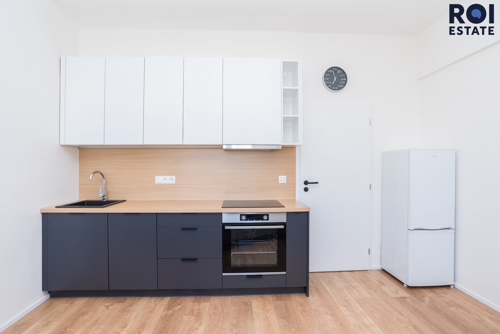 Kuchyňský kout: Moderní kuchyňka vybavená spotřebiči (lednice, sporák/varná deska, trouba), připravená na vaše kulinářské zážitky.