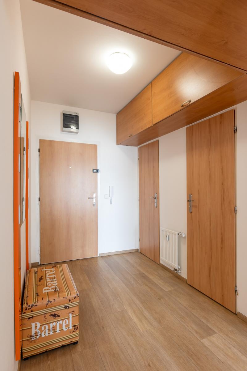 Byt je kompletně vybavený a připravený k okamžitému nastěhování. Dispozice zahrnuje obývací pokoj s kuchyňským koutem, samostatnou ložnici se dvěma prostornými šatními skříněmi, koupelnu včetně pračky, samostatnou toaletu a předsíň s úložnými prostory. Součástí bytu je také balkon, který nabízí příjemné místo k odpočinku. Kuchyňská linka je vybavena všemi potřebnými spotřebiči.