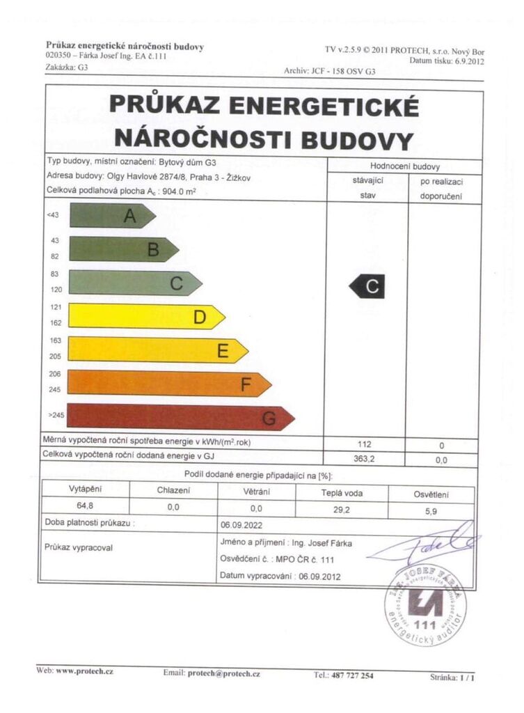 - Ukazatel energetické náročnosti budovy: 112 kWh/m²
