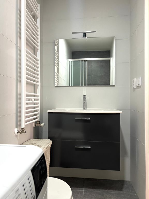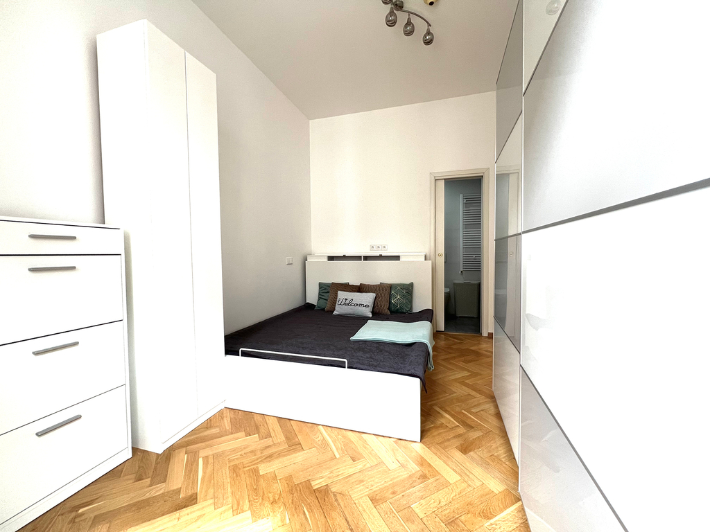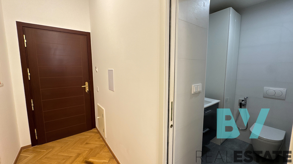 Dispozičně je byt řešen jako obývací pokoj s moderním kuchyňským koutem a jídelní částí, samostatná ložnice, předsíň a dvě koupelny – jedna vybavená vanou, druhá sprchovým koutem a toaletou. Kuchyňská linka je vybavena spotřebiči včetně varné desky, trouby a lednice. Obývací část nabízí pohodlnou sedací soupravu a dostatek úložného prostoru, ložnice je zařízena novou manželskou postelí a šatními skříněmi. V předsíni se nachází další úložné prostory. Okna jsou zdrojem přírodního světla a světlý interiér působí vzdušným dojmem. Byt je ideální pro jednotlivce nebo pár, který ocení kvalitní bydlení s výbornou dostupností do centra města.