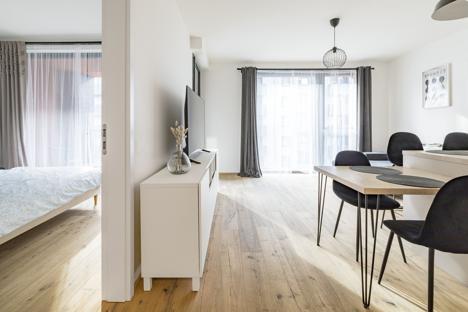 Velkým benefitem bytu je jeho nadstandardní vybavení – v celém bytě je podlahové topení, nechybí klimatizace pro komfort během letních měsíců a na oknech jsou instalovány venkovní rolety, které zajišťují soukromí i regulaci teploty. Součástí vybavení je také pračka se sušičkou, kompletní nábytek včetně postele, sedačky, jídelního stolu a dalších prvků, takže byt je připraven k okamžitému nastěhování bez nutnosti dalších investic.