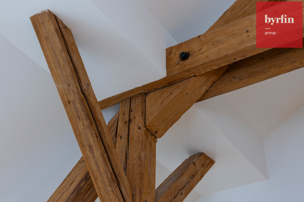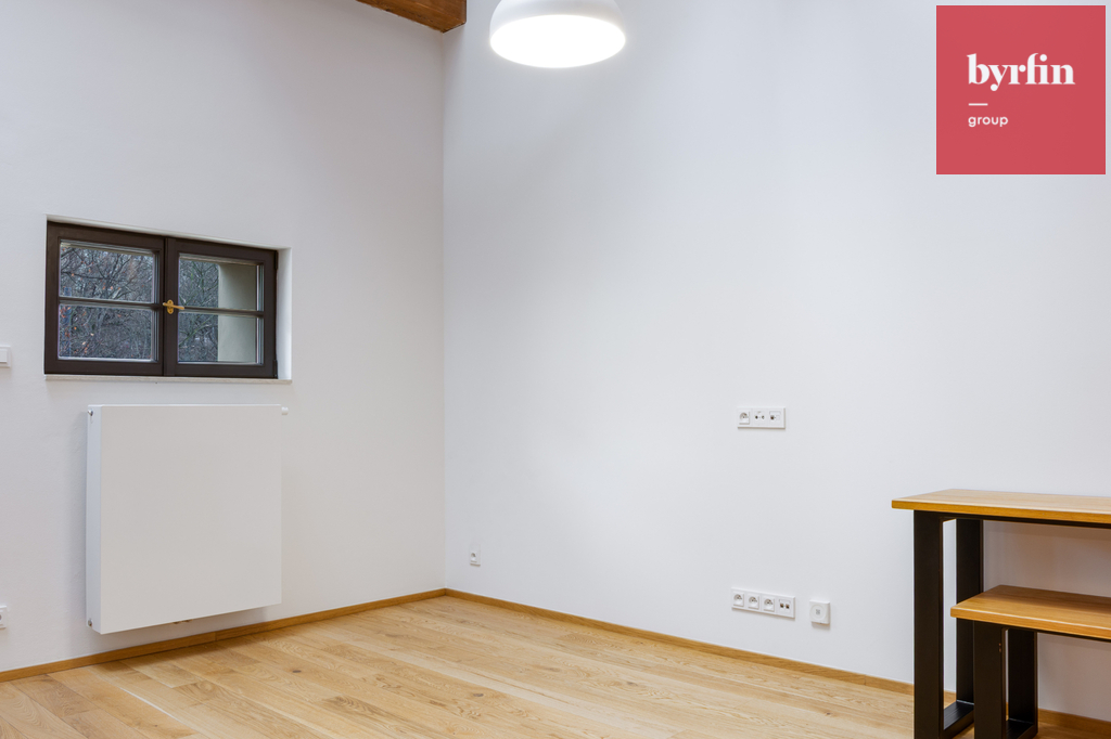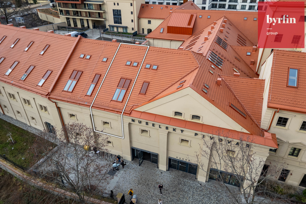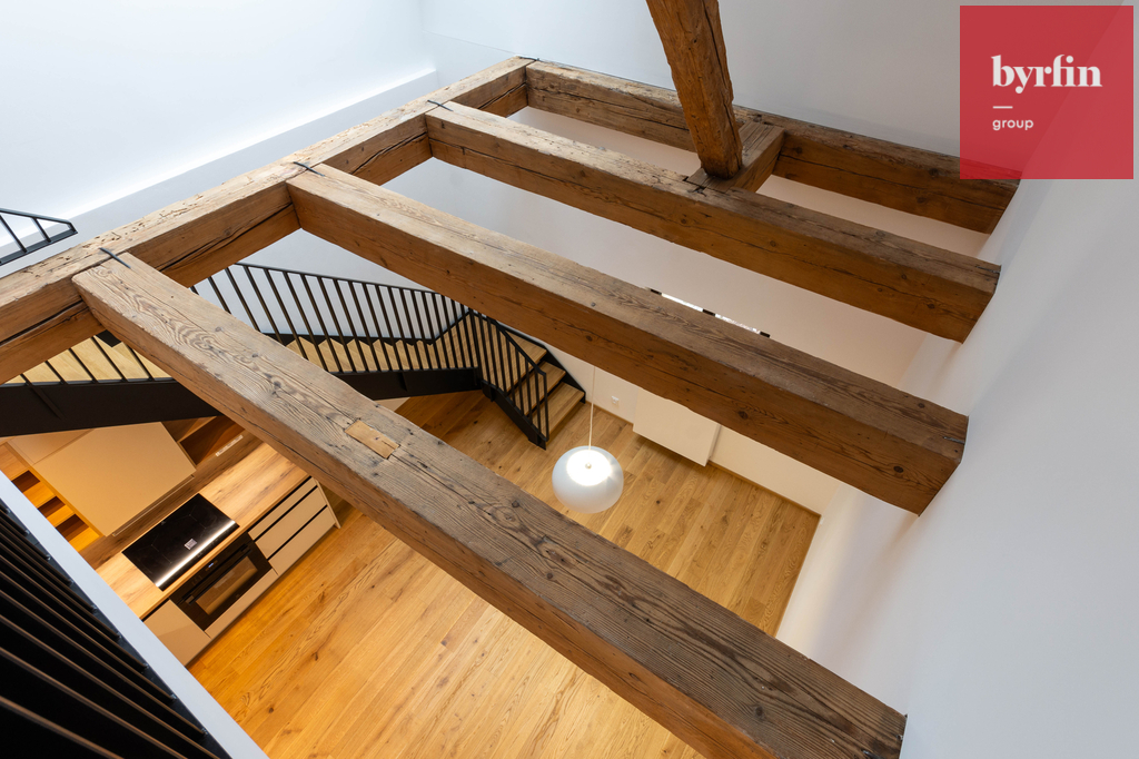 Rezidence je přístupná přes novou lávku a obchodní pasáž. Loftový byt, kde jsou zachovány původní dřevěné trámy, je dispozičně řešen jako 2+kk, 56 m2, v ceně je garážové stání a prostorná sklepní kóje.