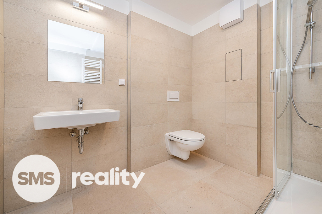 • Koupelna jako z wellness (5 m²): Designová koupelna v pískových tónech disponuje prostorným proskleným sprchovým koutem, závěsnou toaletou, umyvadlem a topným žebříkem.