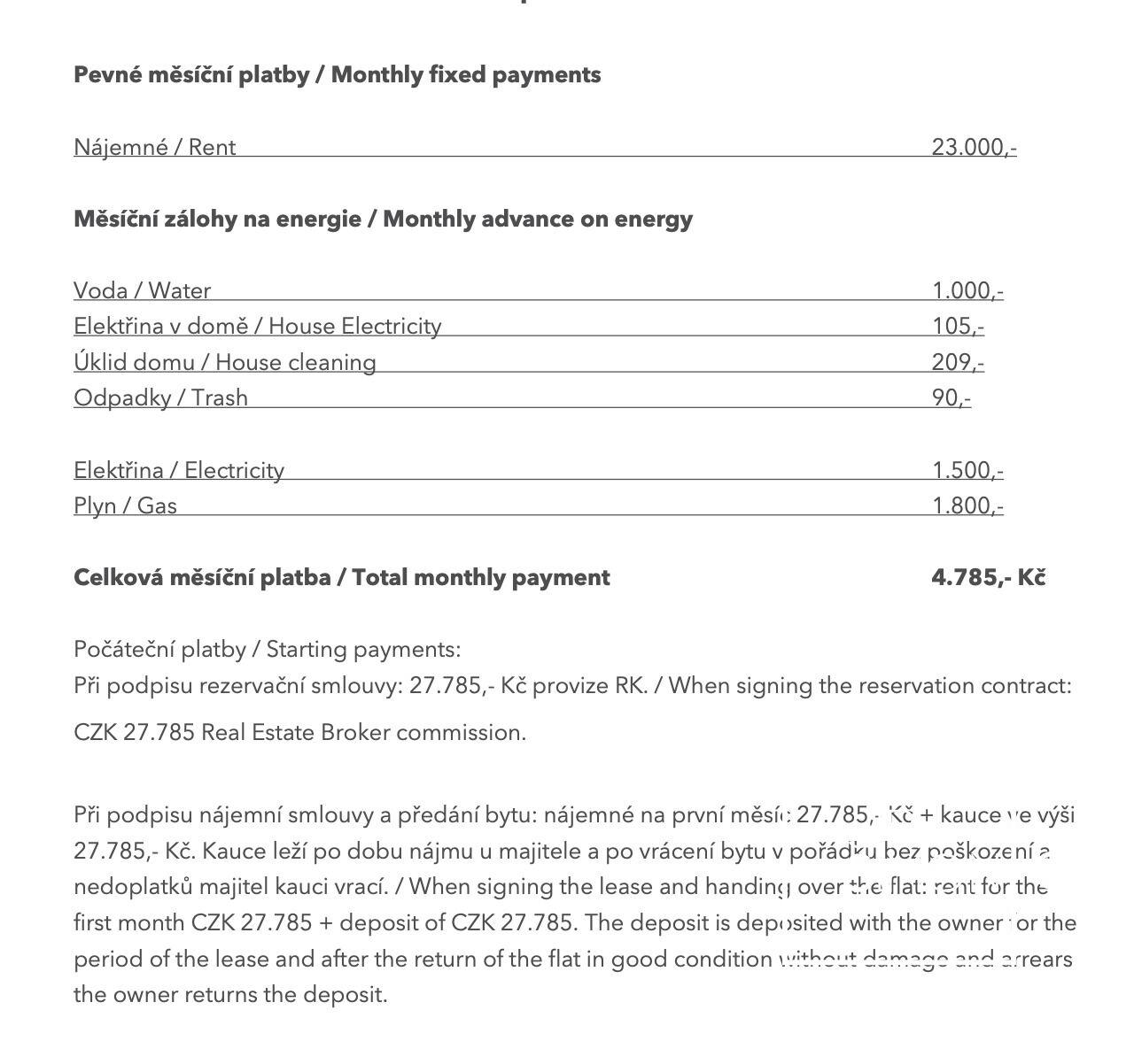 Nájemné je 23.000,- Kč / měsíčně + zálohy na 4.785,- zálohy na energie a služby vč. elektřiny a plynu. Přesný rozpis je uveden ve fotografiích u této nabídky.
