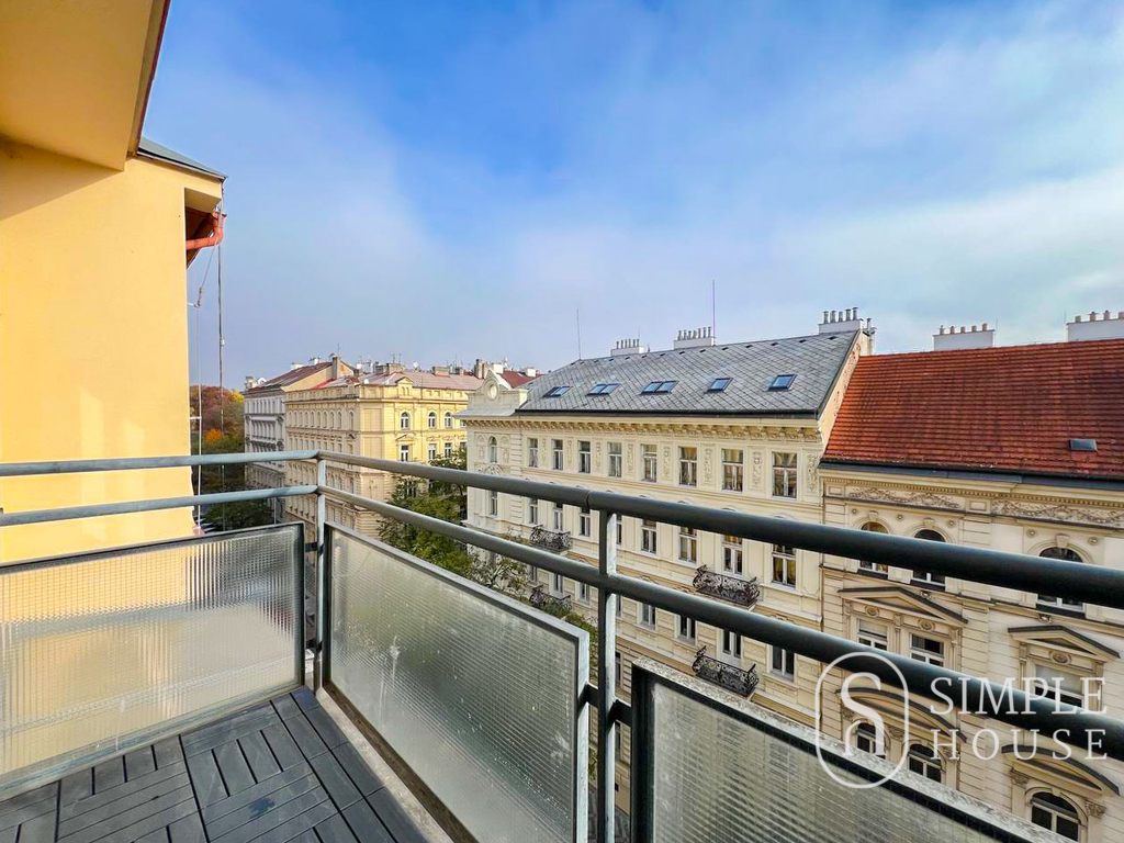 Dominantou bytu je prostorný obývací pokoj s kuchyňským koutem, který poskytuje dostatek prostoru pro pohodlné každodenní fungování i relaxaci. Z oken i z terasy o rozloze 3,8 m² se otevírá nádherný výhled na Národní muzeum a střechy Prahy, což umocňuje jedinečnost tohoto bydlení.