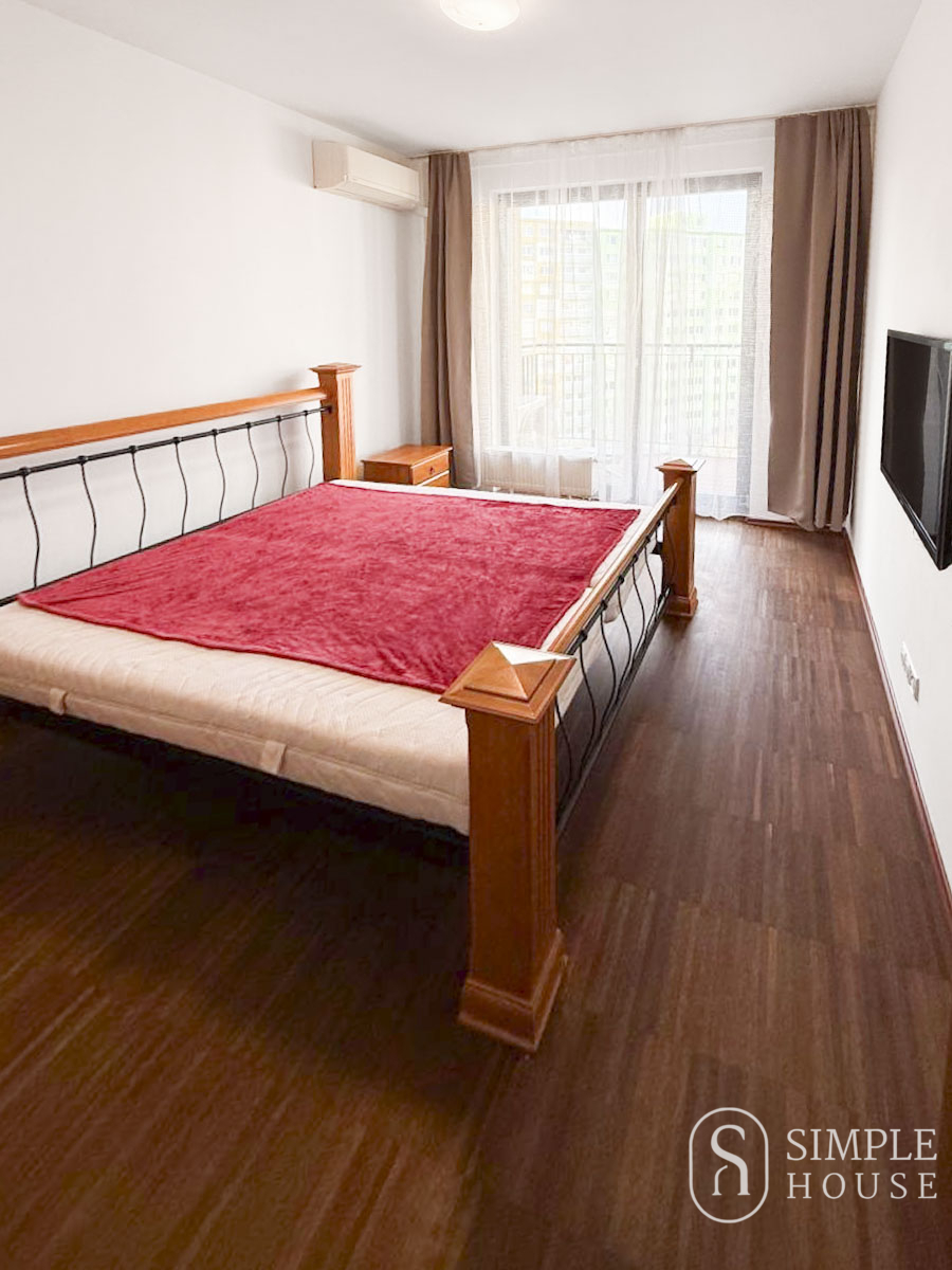 Byt se skládá z prostorného obývacího pokoje s kuchyňskou linkou a samostatné ložnice. K bytu náleží balkon o ploše 4 m². V obývacím pokoji se nachází plně vybavená kuchyňská linka se všemi spotřebiči, pohovka, jídelní stůl, televize a obývací stěna. V samostatné ložnici je manželská postel a televize.