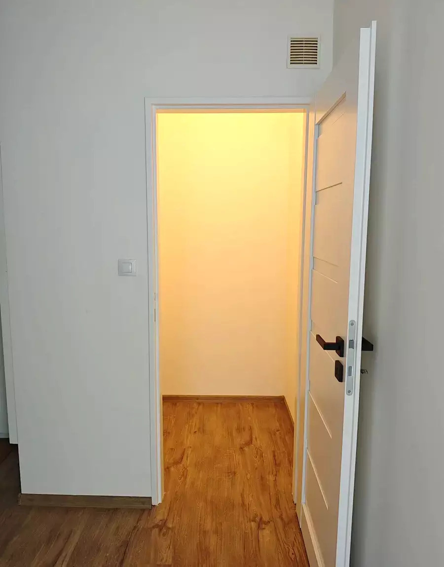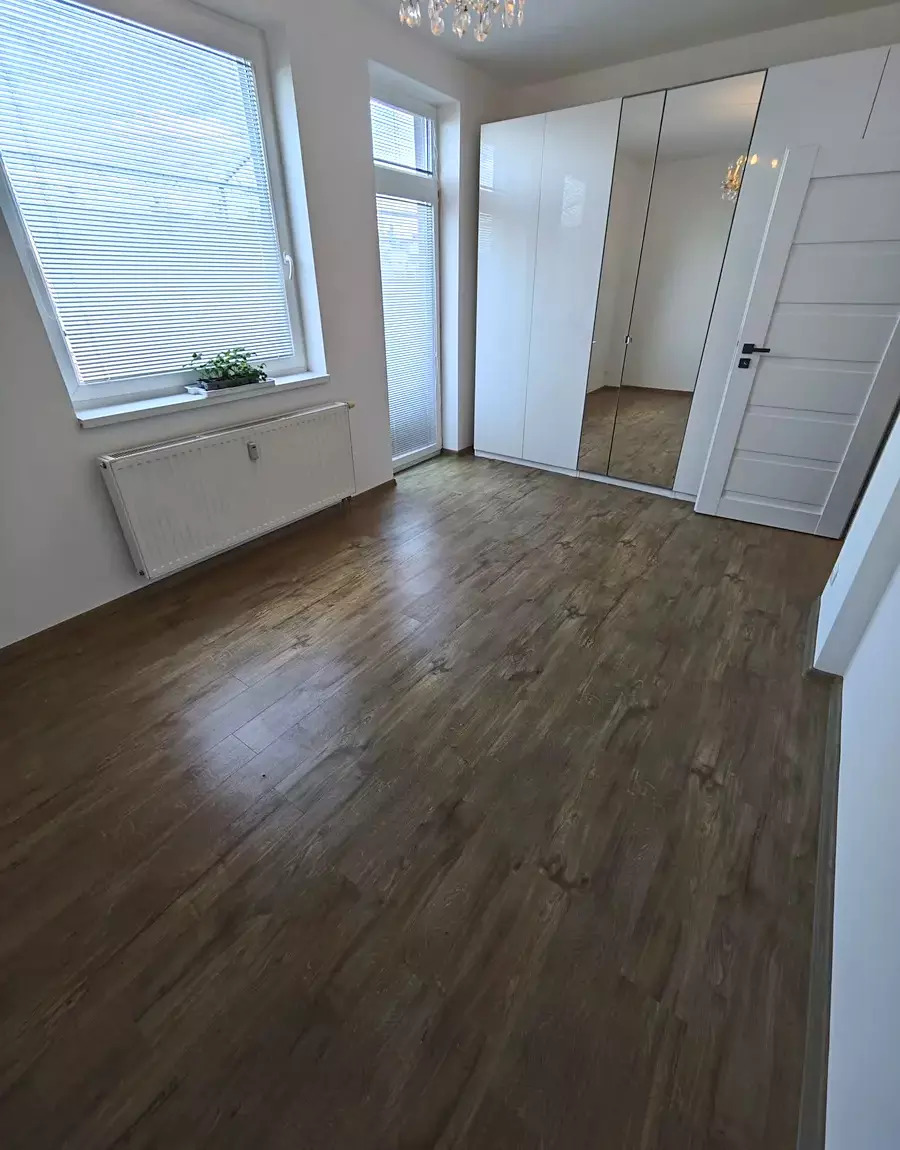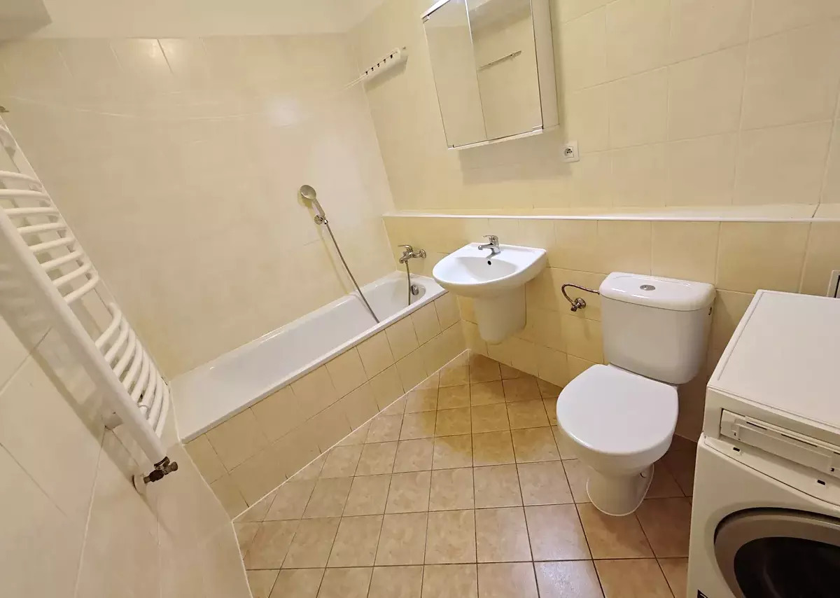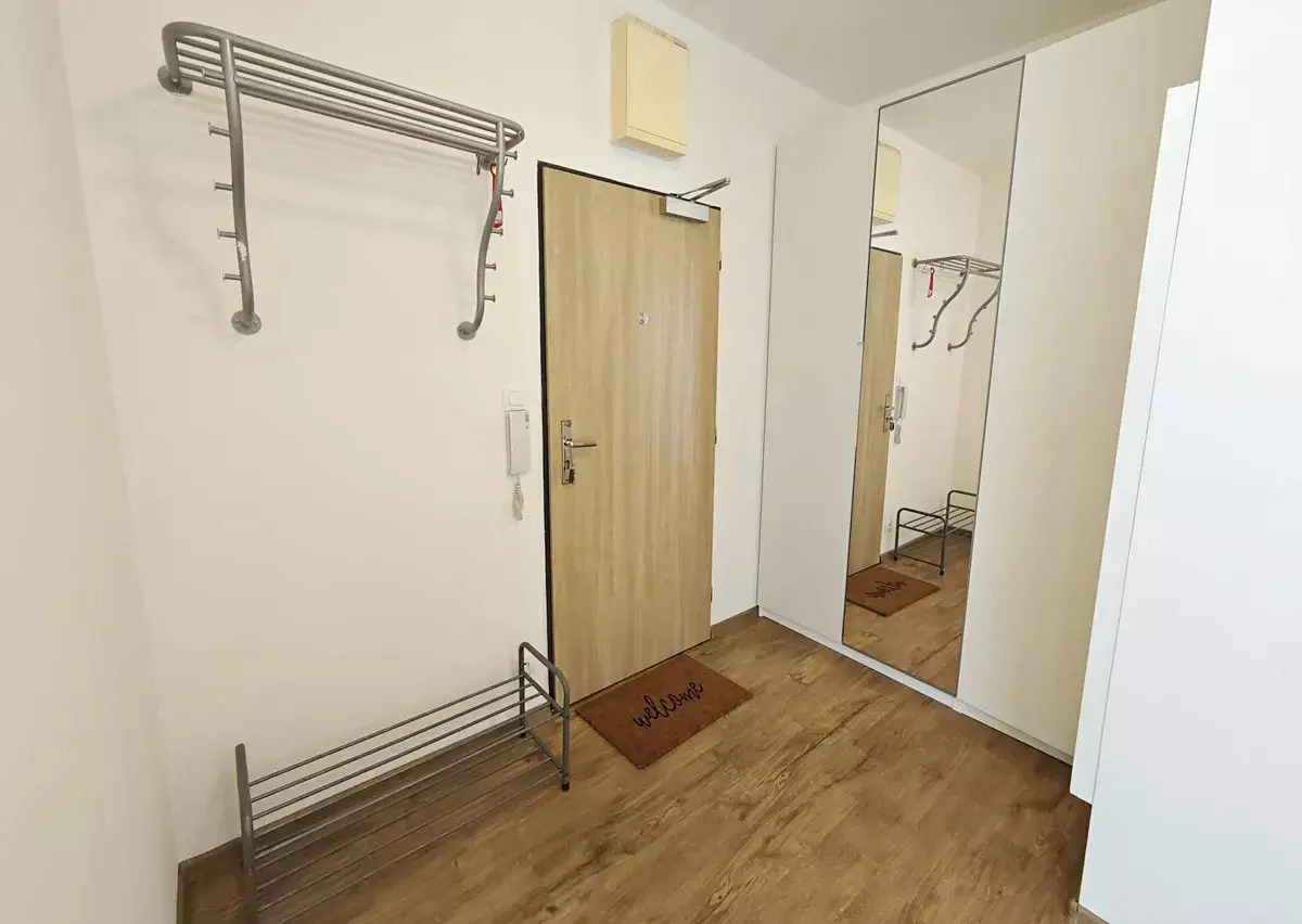Vstupní chodba má prostornou skříň a zajišťuje přístup do všech místností, včetně koupelny a samostatné komory uvnitř bytu. Obývací pokoj je propojen s kuchyňským koutem, který je vybaven lednicí, myčkou, troubou, varnou deskou a výkonnou digestoří. Ložnice disponuje skříněmi cca 3m x 2,6, zároveň je z ní i z obývacího pokoje vstup na nadstandardně velký balkón (16m2). Pokoje jsou neprůchozí. Byt se pronajímá částečně zařízený, po domluvě možné zařídit. K bytu náleží garážové stání naproti výtahu.