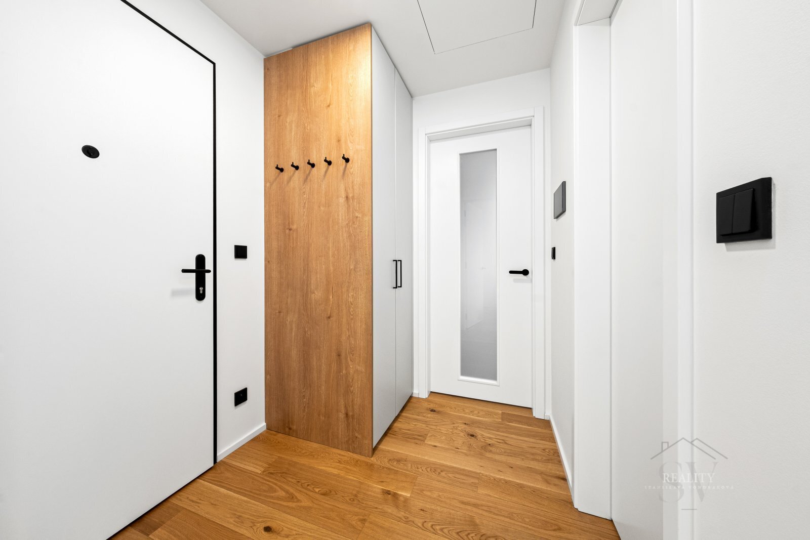 Vstupní chodba je vybavena vestavěnými skříněmi s maximální úložnou kapacitou.