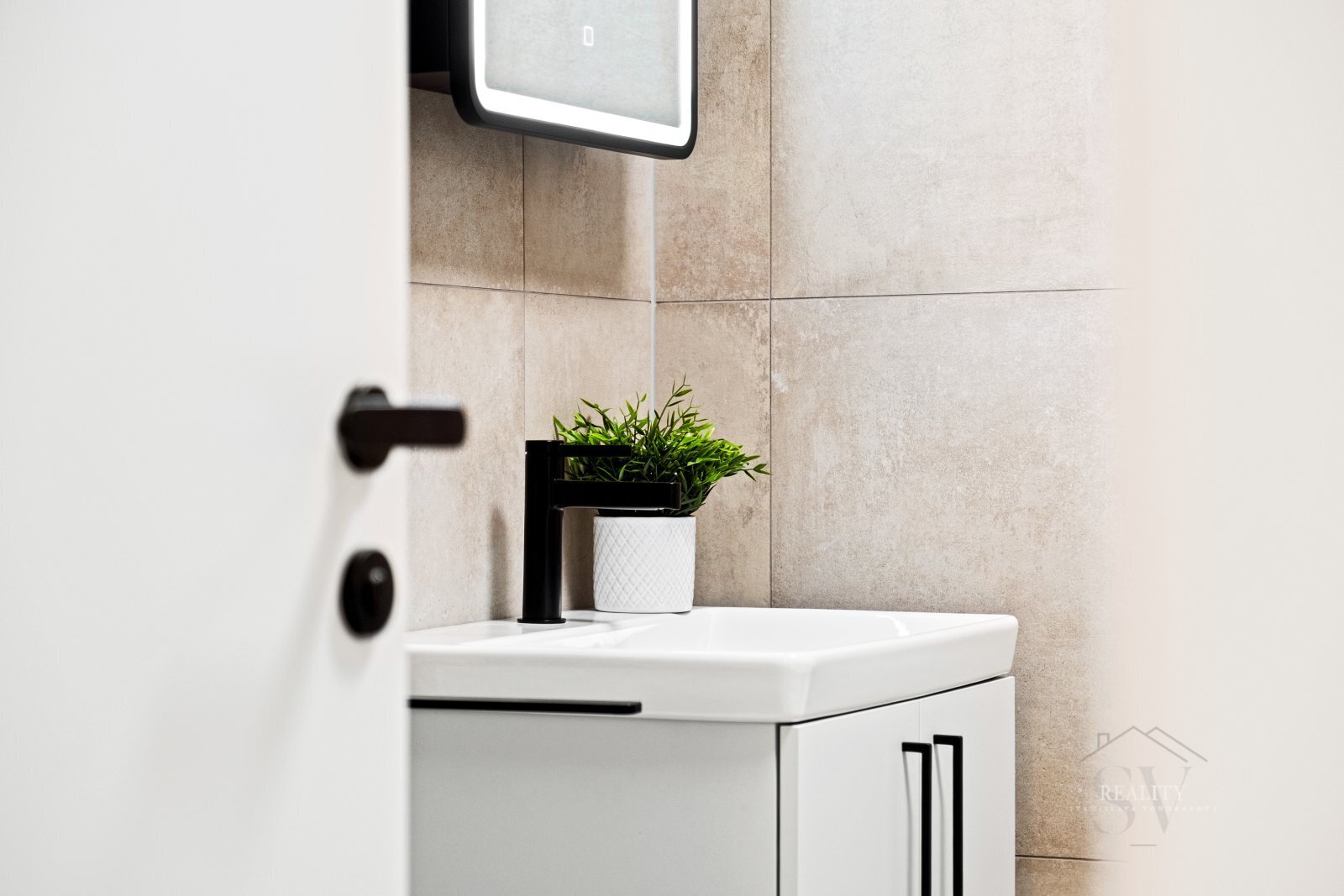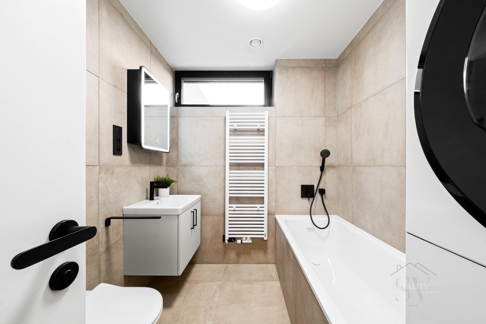 Koupelna je provedena v nadstandardu – sanitární keramika Villeroy & Boch, komfortní vana, kvalitní obklady, úložné prvky na míru, pračka + sušička Bosch.