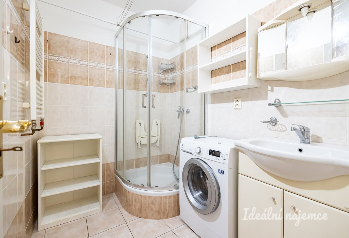 Byt se skládá ze vstupní chodby se dvěma velkými, vestavěnými skříněmi, samostatné toalety, koupelny se sprchovým koutem, pračkou a umyvadlem, ložnice a obývacího pokoje se vstupem na lodžii.