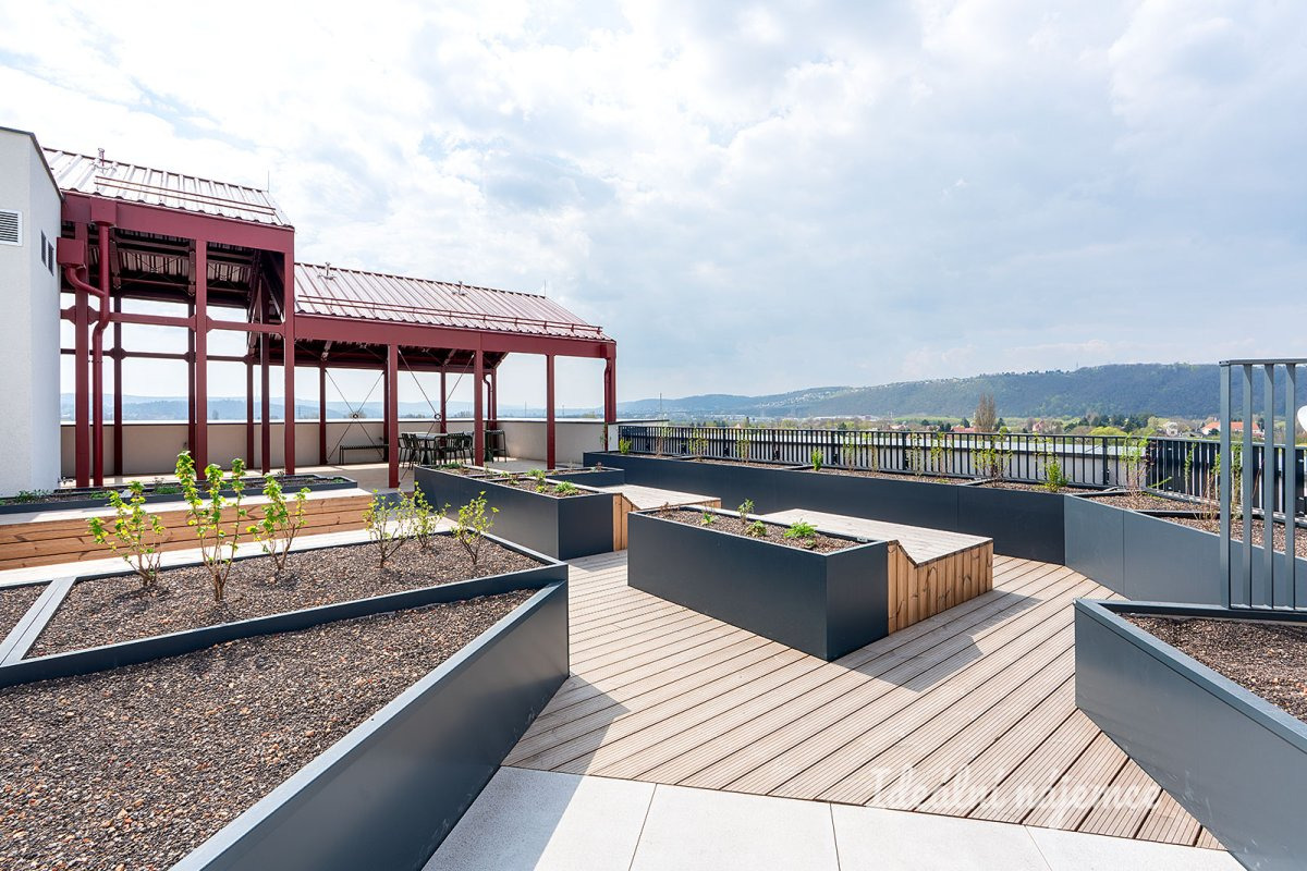 Jako exklusivní bonus je součástí projektu velká společná střešní terasa. Je to místo s úchvatným výhledem, kde můžete grilovat, pořádat sešlosti s přáteli nebo jen tak sledovat západ slunce nad Vltavou.