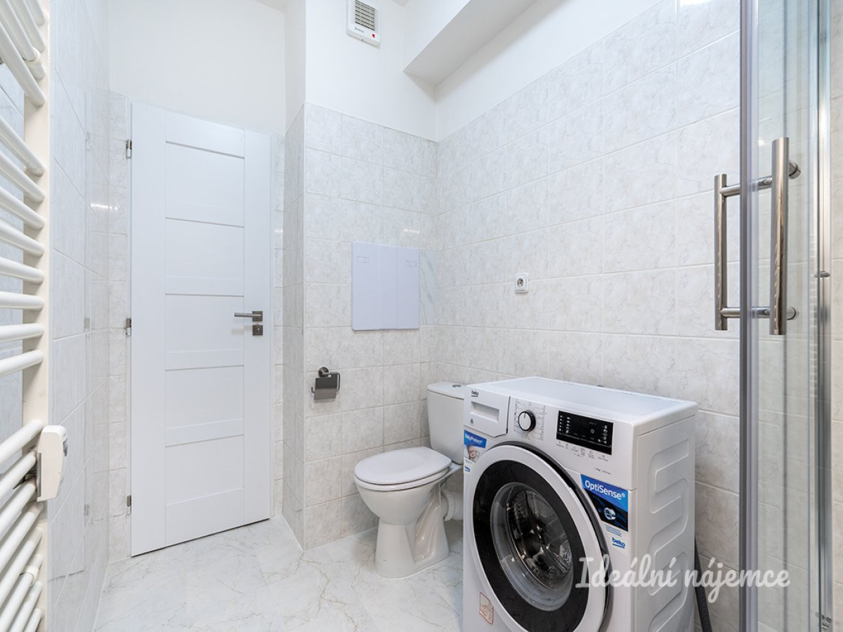 Koupelna je vybavena novým sprchovým koutem, umyvadlem a toaletou. V koupelně je také pračka.